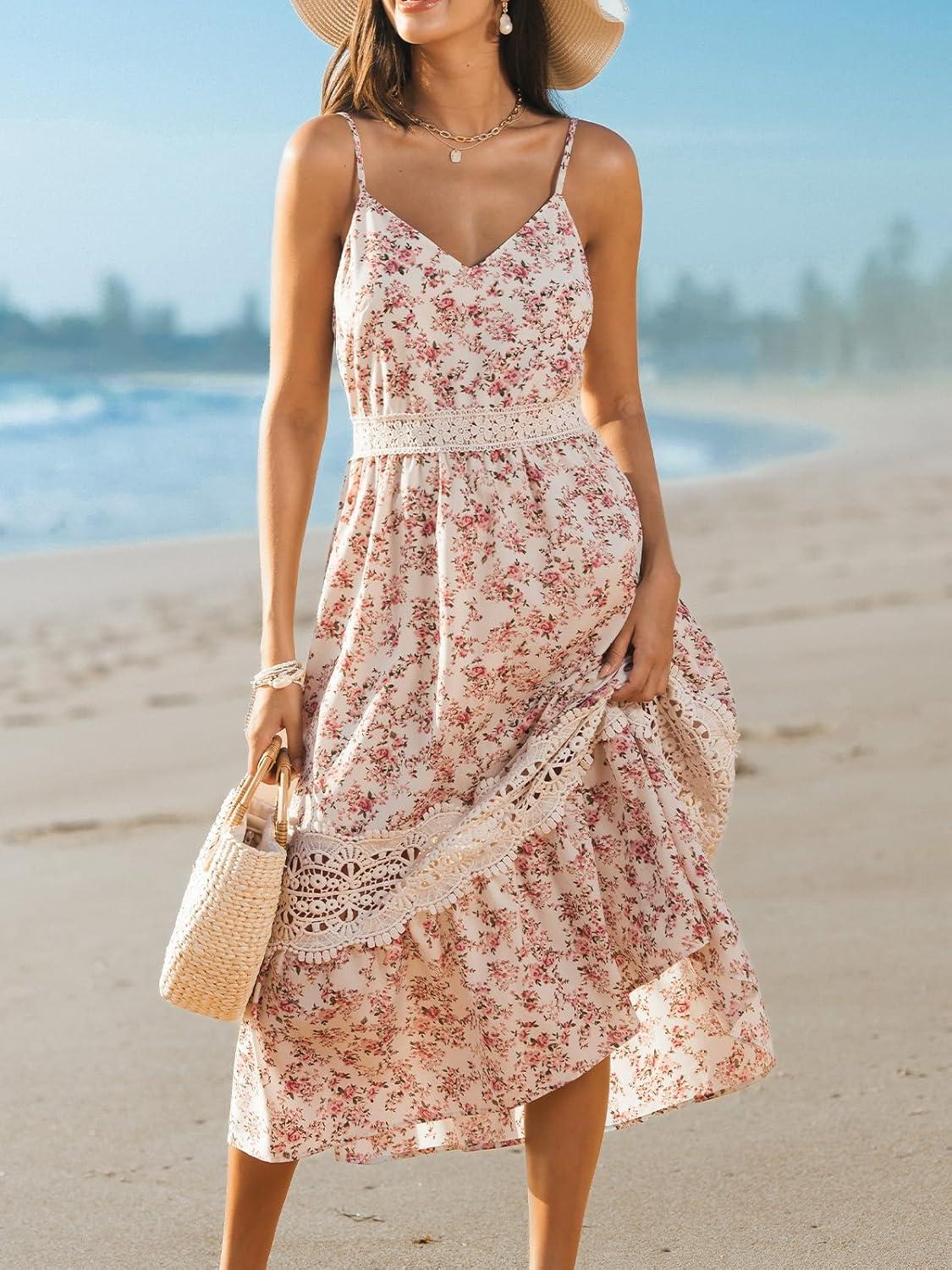 CUPSHE Summer Dresses for Women 2025 Long V Neck Floral Lace Casual Sleeveless A Line Sundress Beach Midi Dress(Beige Floral)