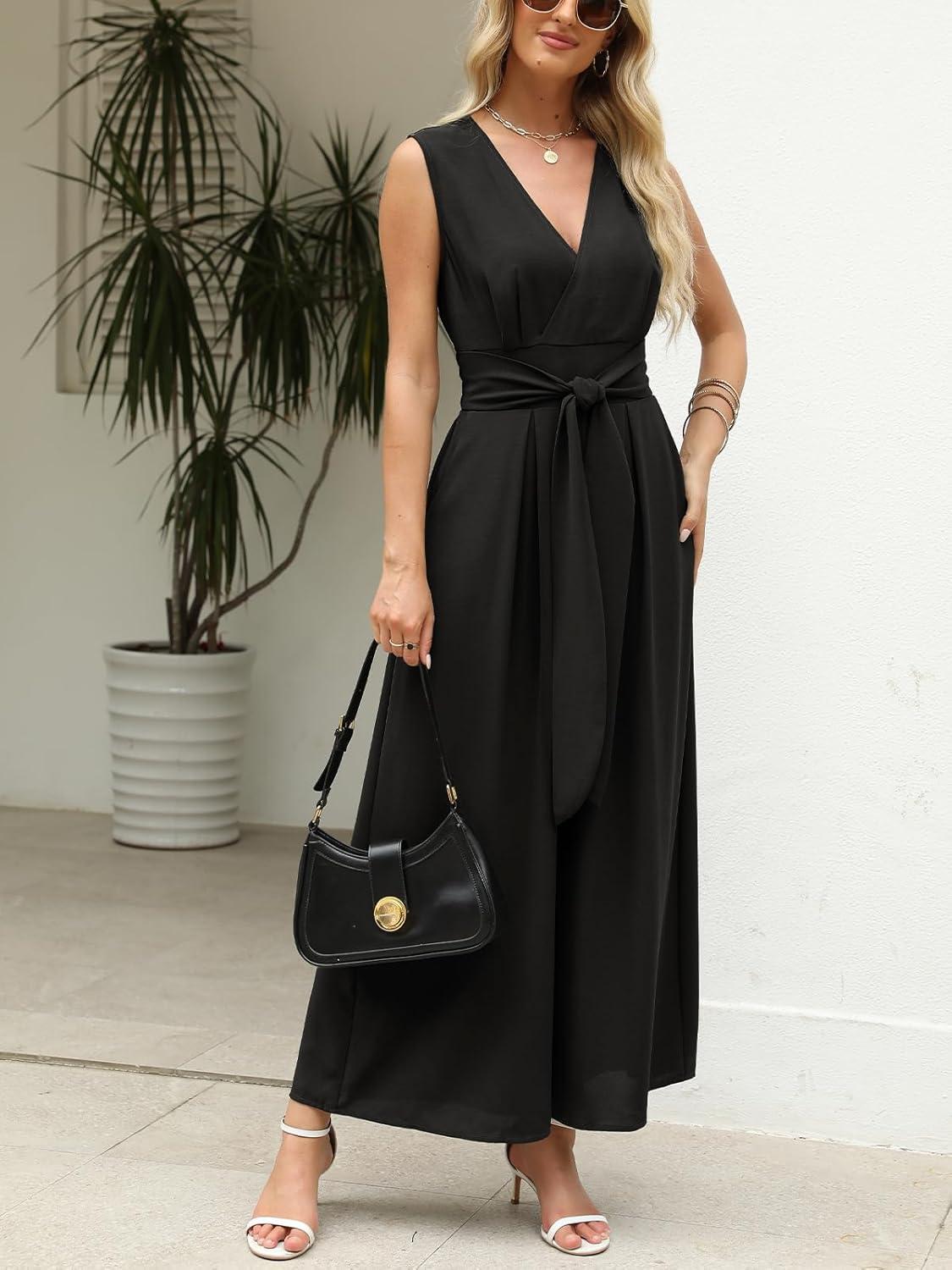 CUPSHE Women’s Sleeveless V Neck Jumpsuit Summer Tied Wide Leg One Piece Romper Casual Elegant Outfit Beach Vacation(Black)