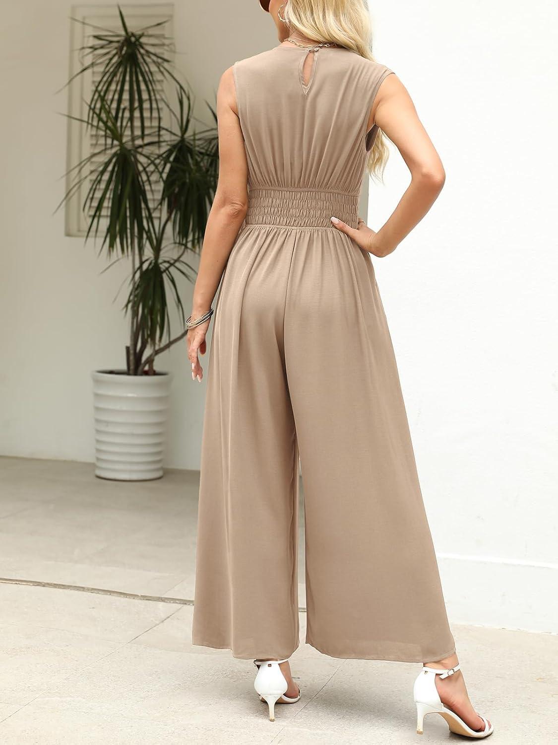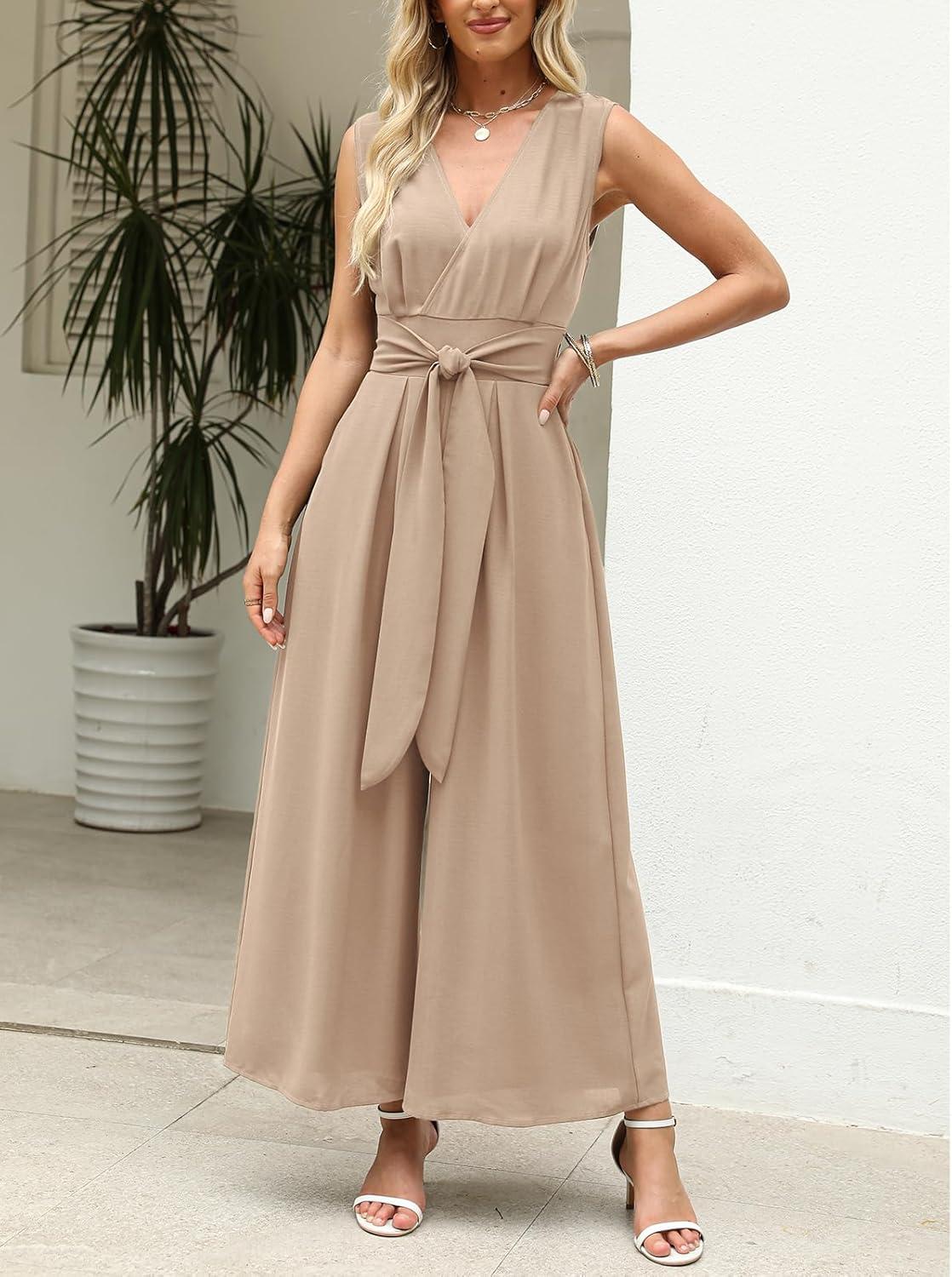 CUPSHE Women’s Sleeveless V Neck Jumpsuit Summer Tied Wide Leg One Piece Romper Casual Elegant Outfit Beach Vacation(Khaki)