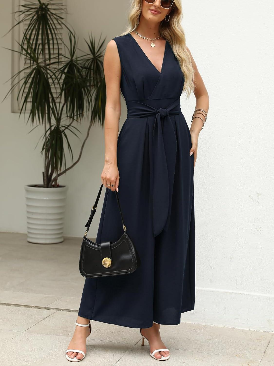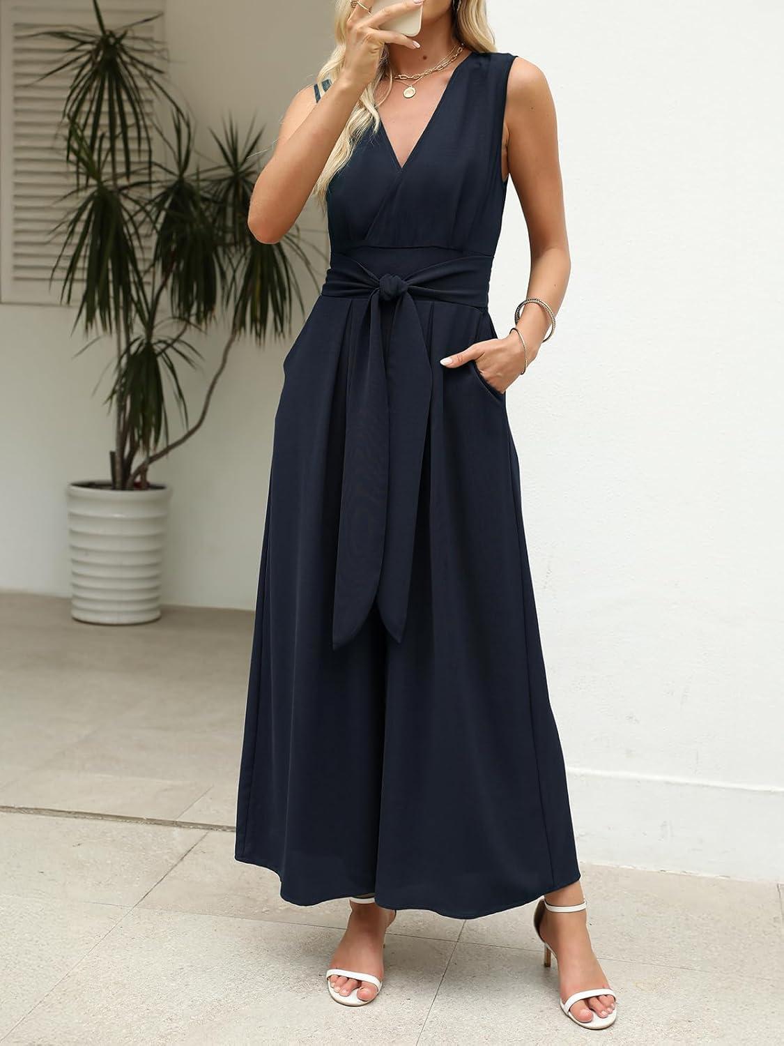 CUPSHE Women’s Sleeveless V Neck Jumpsuit Summer Tied Wide Leg One Piece Romper Casual Elegant Outfit Beach Vacation(Navy Blue)