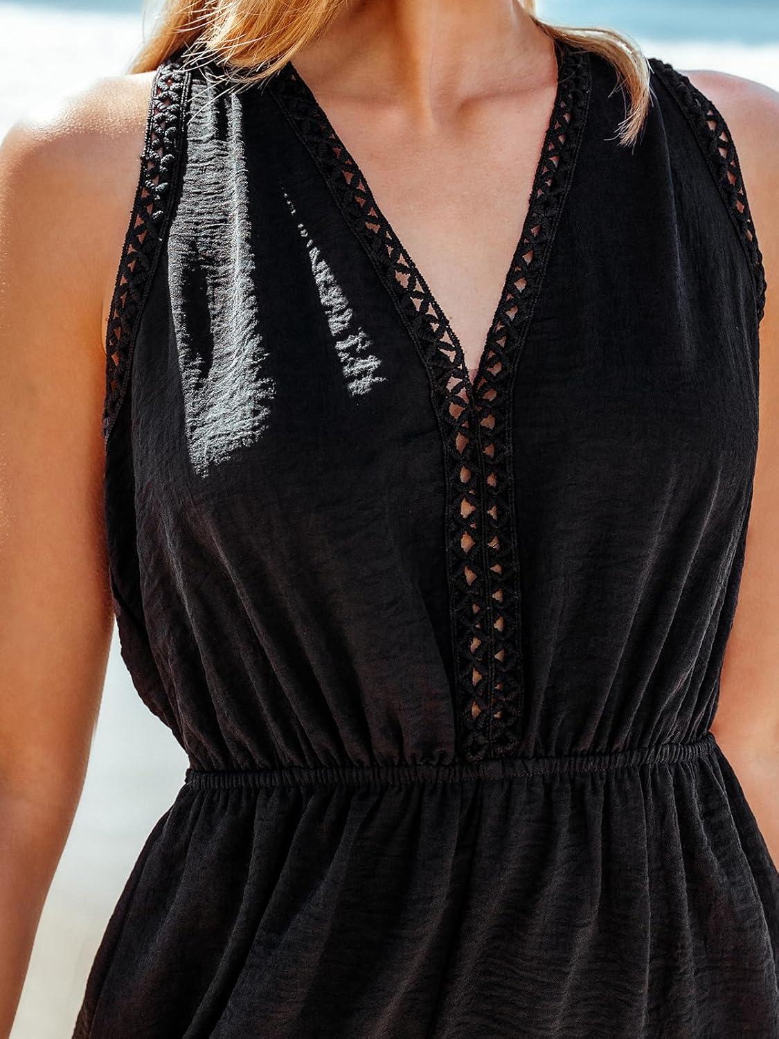 CUPSHE Women’s Sleeveless Plunging Keyhole Wide Leg Jumpsuit Eyelet Summer Beach Vacation Cover Up Romper(Black)