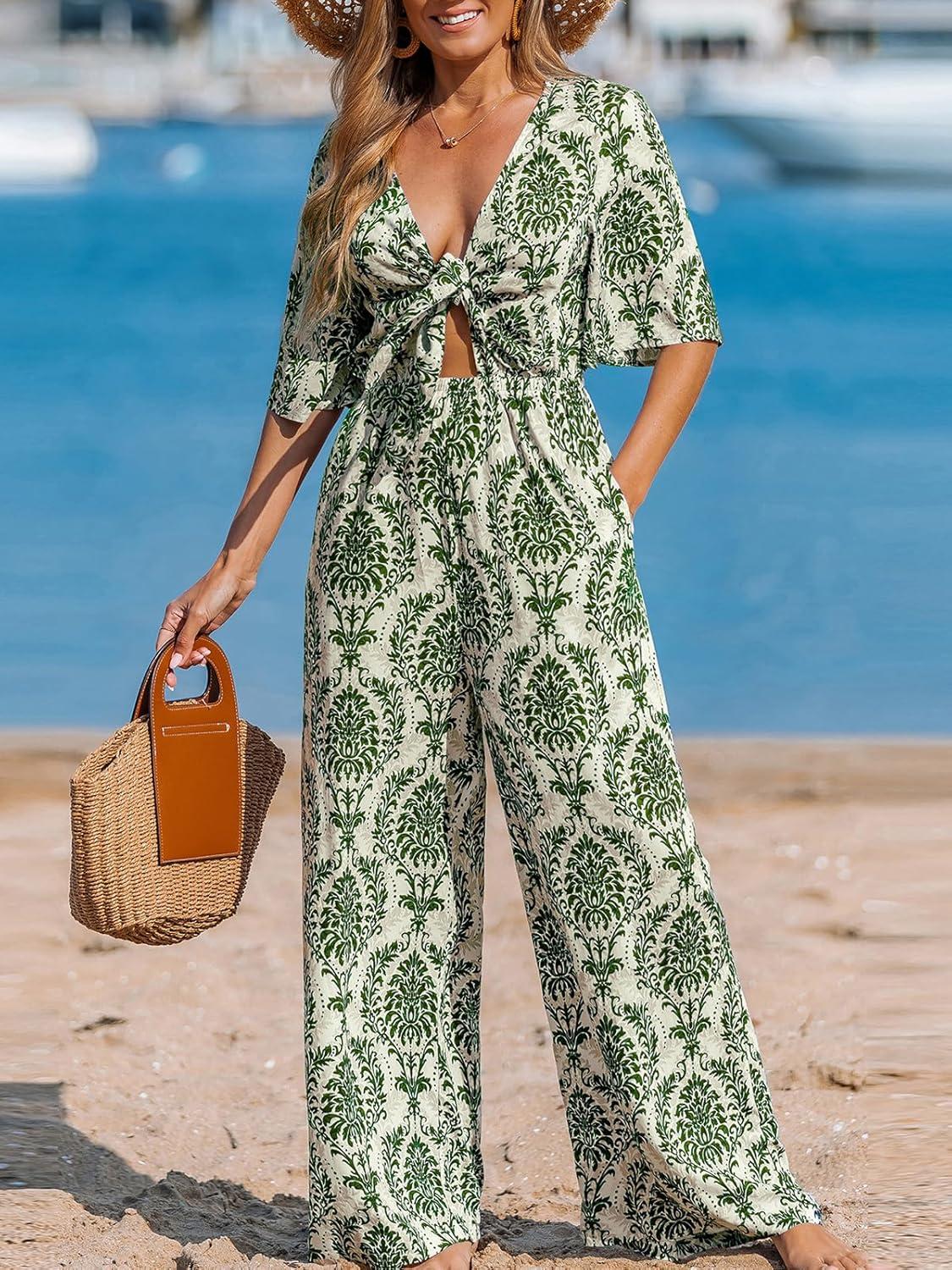 CUPSHE Women’s Summer Jumpsuit Short Sleeve V Neck Self Tie Tropical Floral Wide Leg Beach Vacation Romper(Green)
