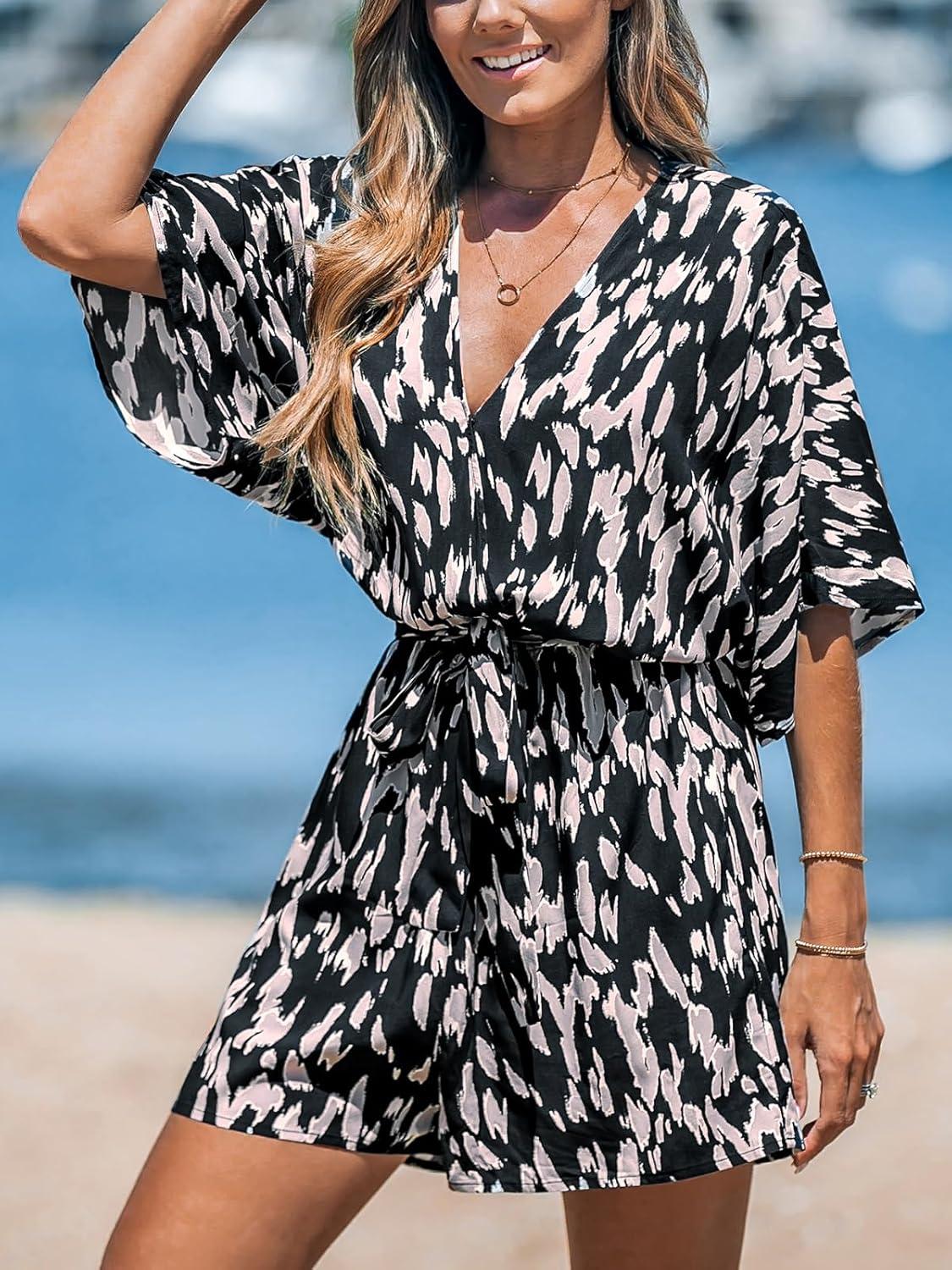 CUPSHE Women’s Summer Romper Lace Up Printed Half Sleeves Casual Wide leg Vacation Outfit Mini One Piece Jumpsuit(Black Leopard)