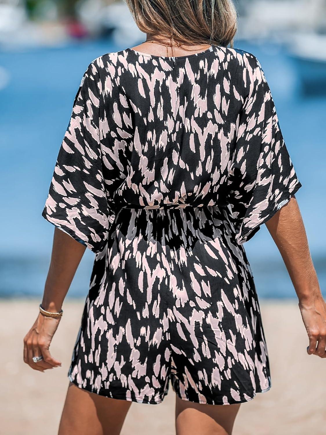 CUPSHE Women’s Summer Romper Lace Up Printed Half Sleeves Casual Wide leg Vacation Outfit Mini One Piece Jumpsuit(Black Printed)