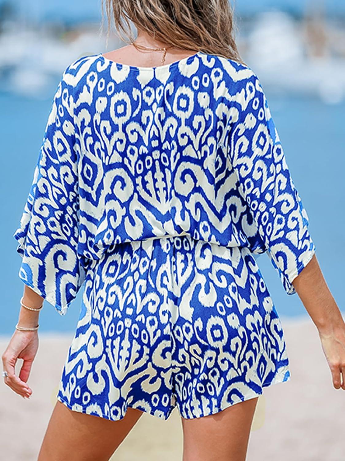 CUPSHE Women’s Summer Romper Lace Up Printed Half Sleeves Casual Wide leg Vacation Outfit Mini One Piece Jumpsuit(Blue)