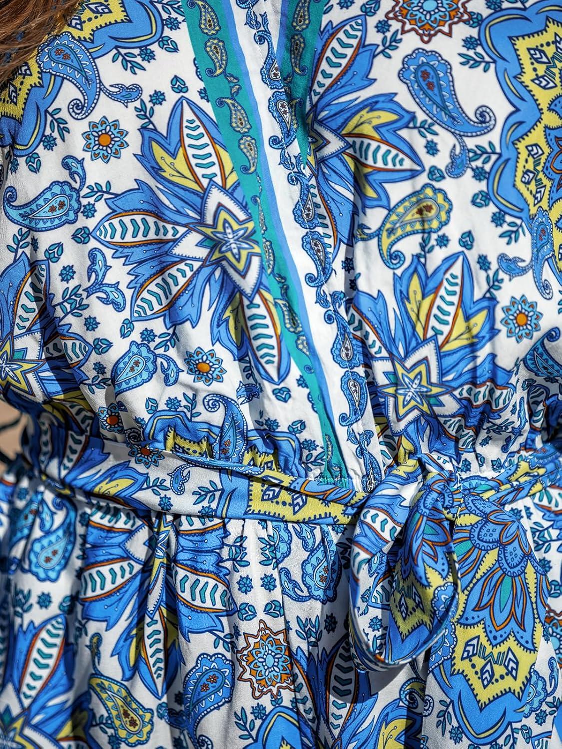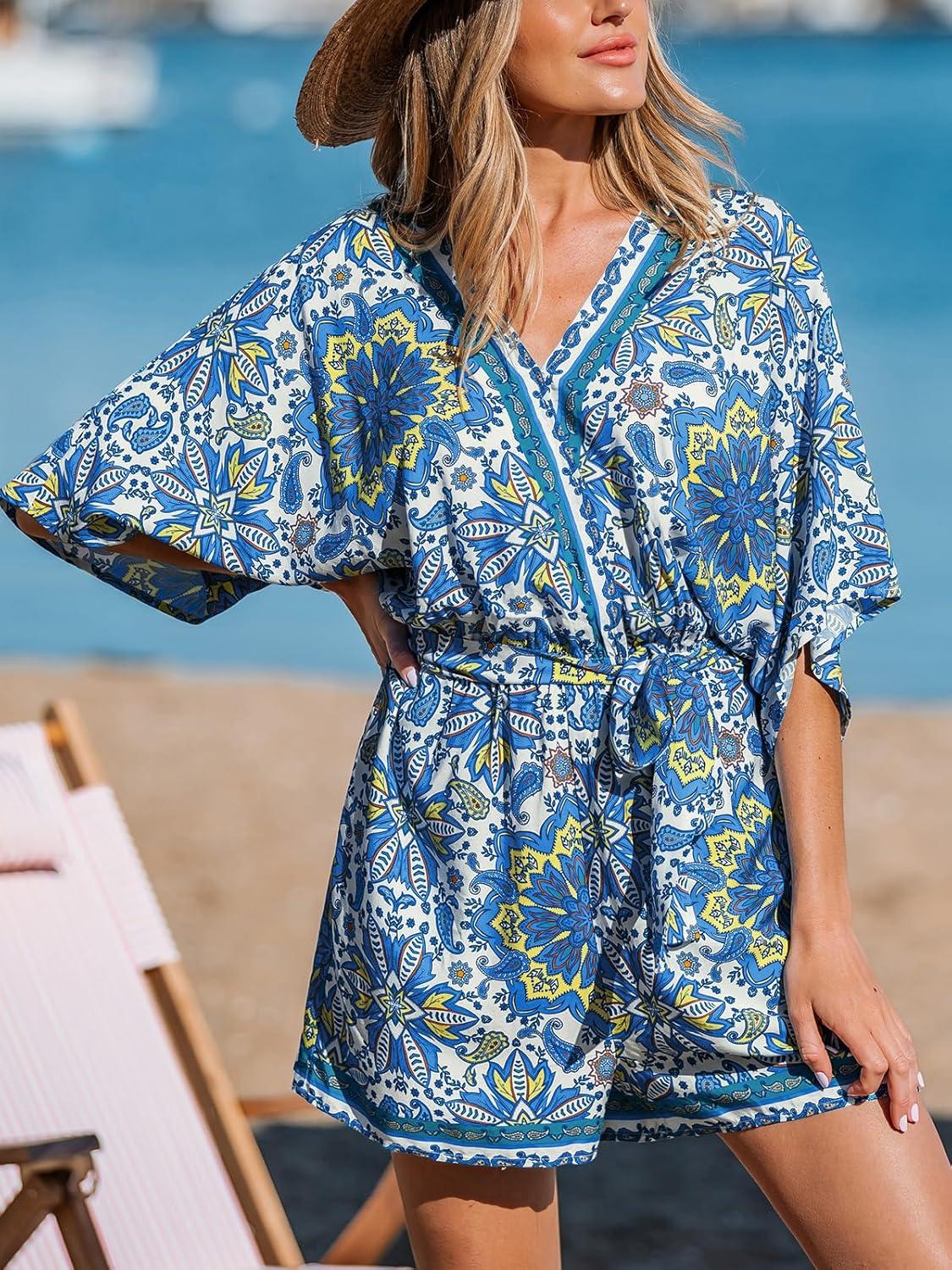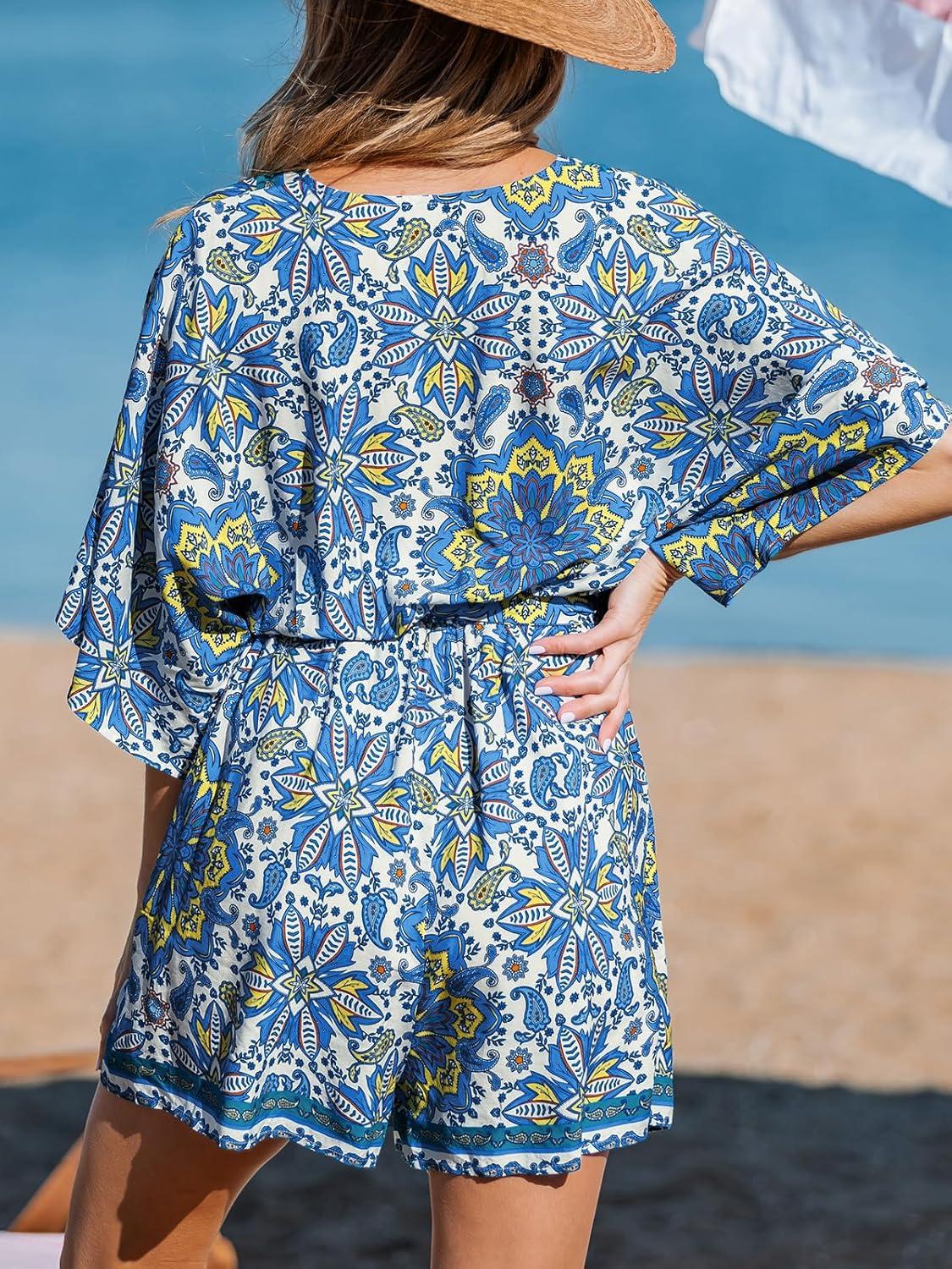 CUPSHE Women’s Summer Romper Lace Up Printed Half Sleeves Casual Wide leg Vacation Outfit Mini One Piece Jumpsuit(Blue Paisley)