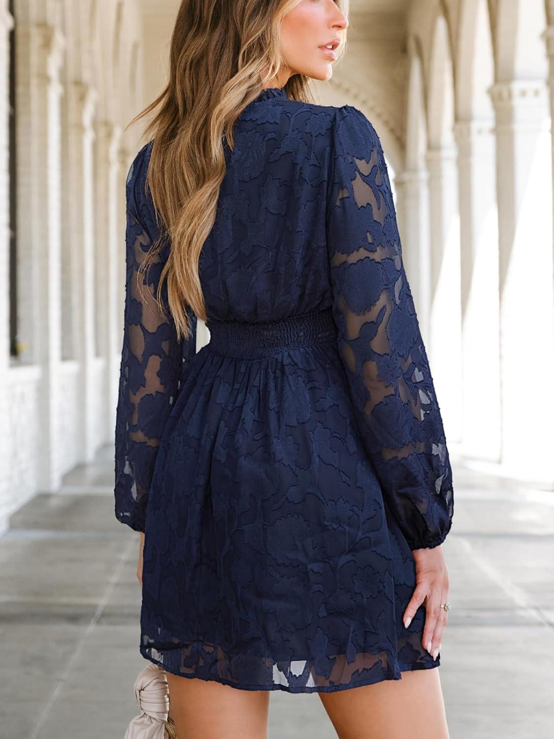 CUPSHE Women Fall Wedding Guest Dresses Lace V Neck Ruffle Smocked A Line Cocktail Mini Dress(Navy)