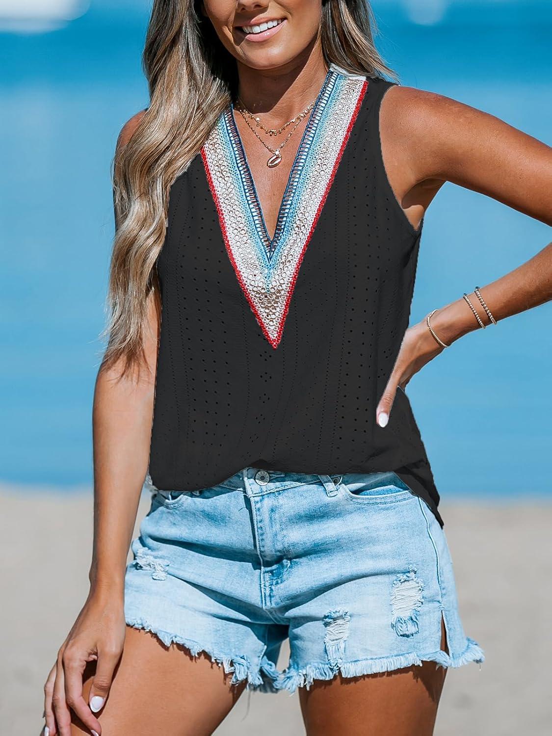 CUPSHE Women Eyelet Tops V Neck Embroidered Jersey Tank Lace Cutout Blouses Tee Sleeveless Shirt Casual(Black)
