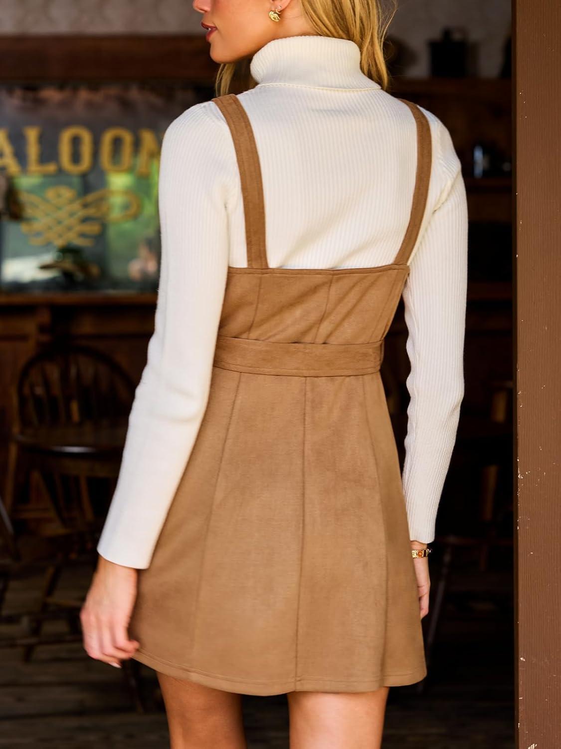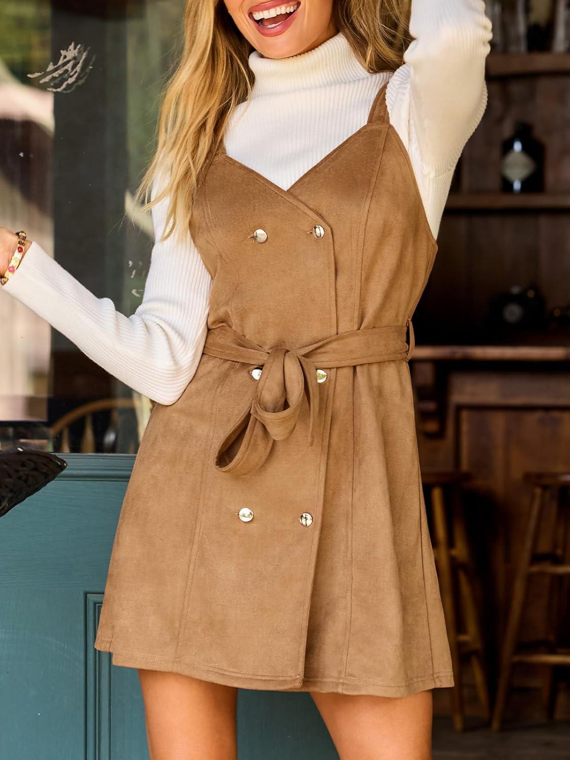 CUPSHE Women Fall Overall Dresses Faux Suede V Neck Button Down Belted Tie Pinafore Mini Dress(Brown)