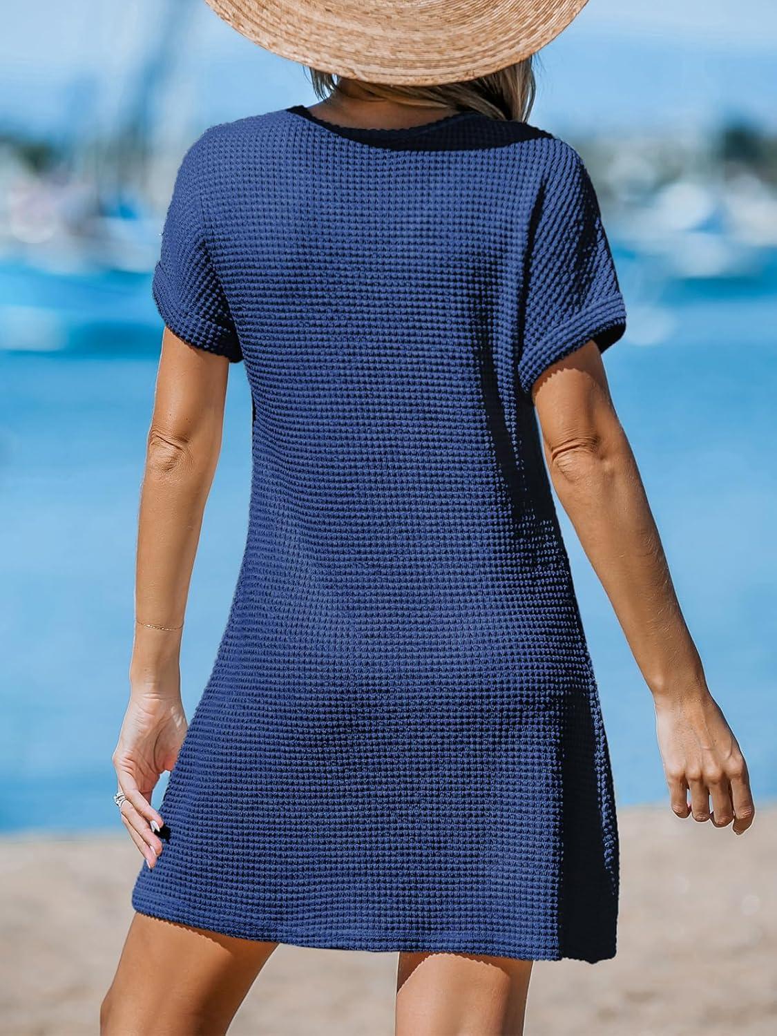 CUPSHE Bathing Suit Cover Up for Women Waffle Knit Twisted Beach Dress Short Sleeve Summer Swimsuit Coverup Swimwear(Dark Blue)