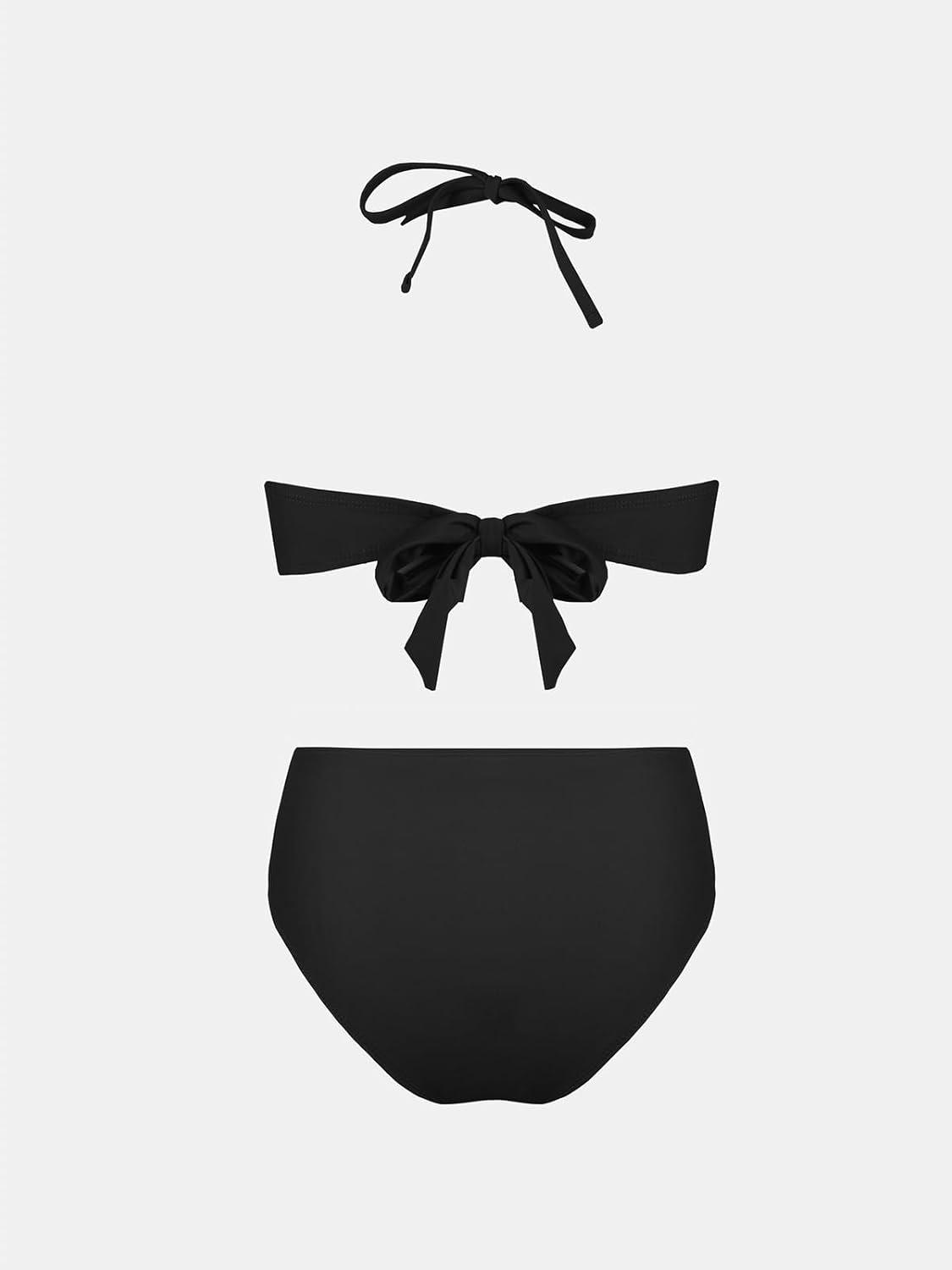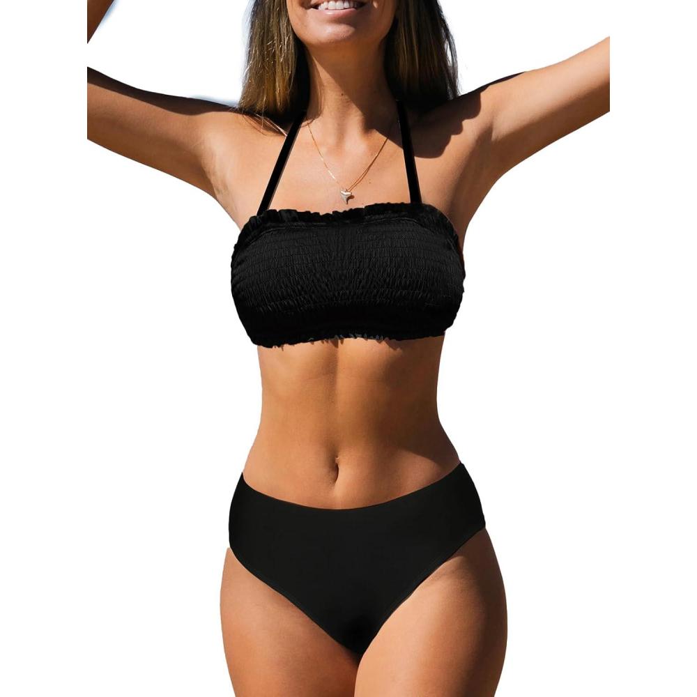 CUPSHE Bikini Set for Women Two Piece Swimsuit Bandeau Top Back Tie Mid Waisted Bottom with Removable Shoulder Straps(Black)