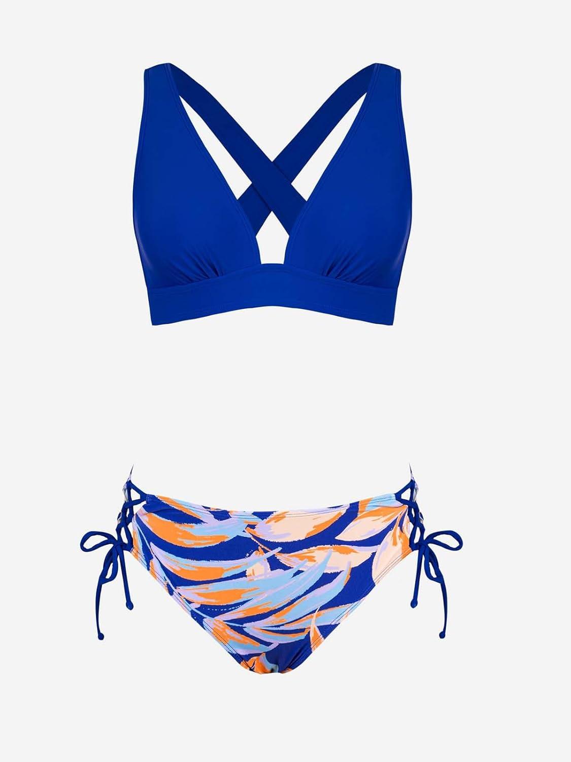 CUPSHE Bikini Set for Women Two Piece Swimsuit V Neck Triangle Top Wide Straps Cross Back Lace up Mid Rise(Navy Blue/Tropical)