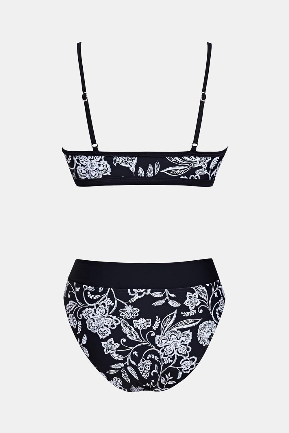 CUPSHE Bikini Set for Women Two Piece Swimsuits Cut Out High Waisted Scoop Neck V Cut Bottom(Black/White Floral)