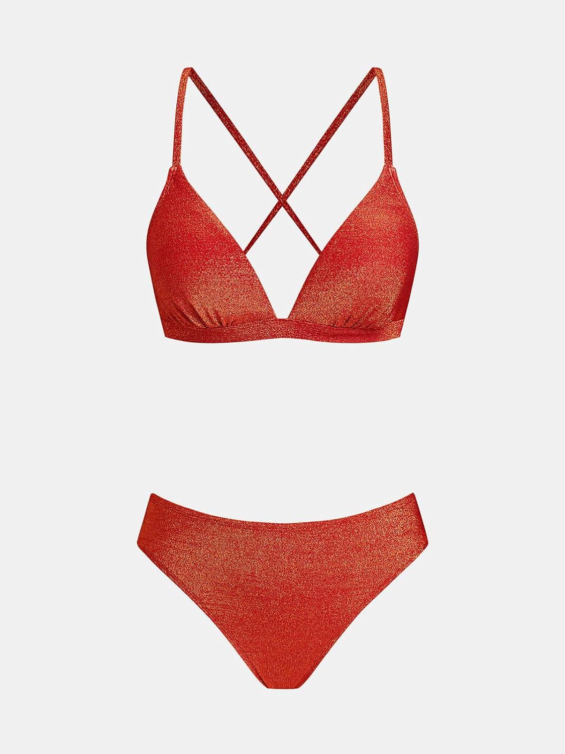 CUPSHE Bikini Set for Women Two Piece Swimsuits V Neck Low Rise Crisscross Back Self Tie Spaghetti Straps(Sparkle Red)