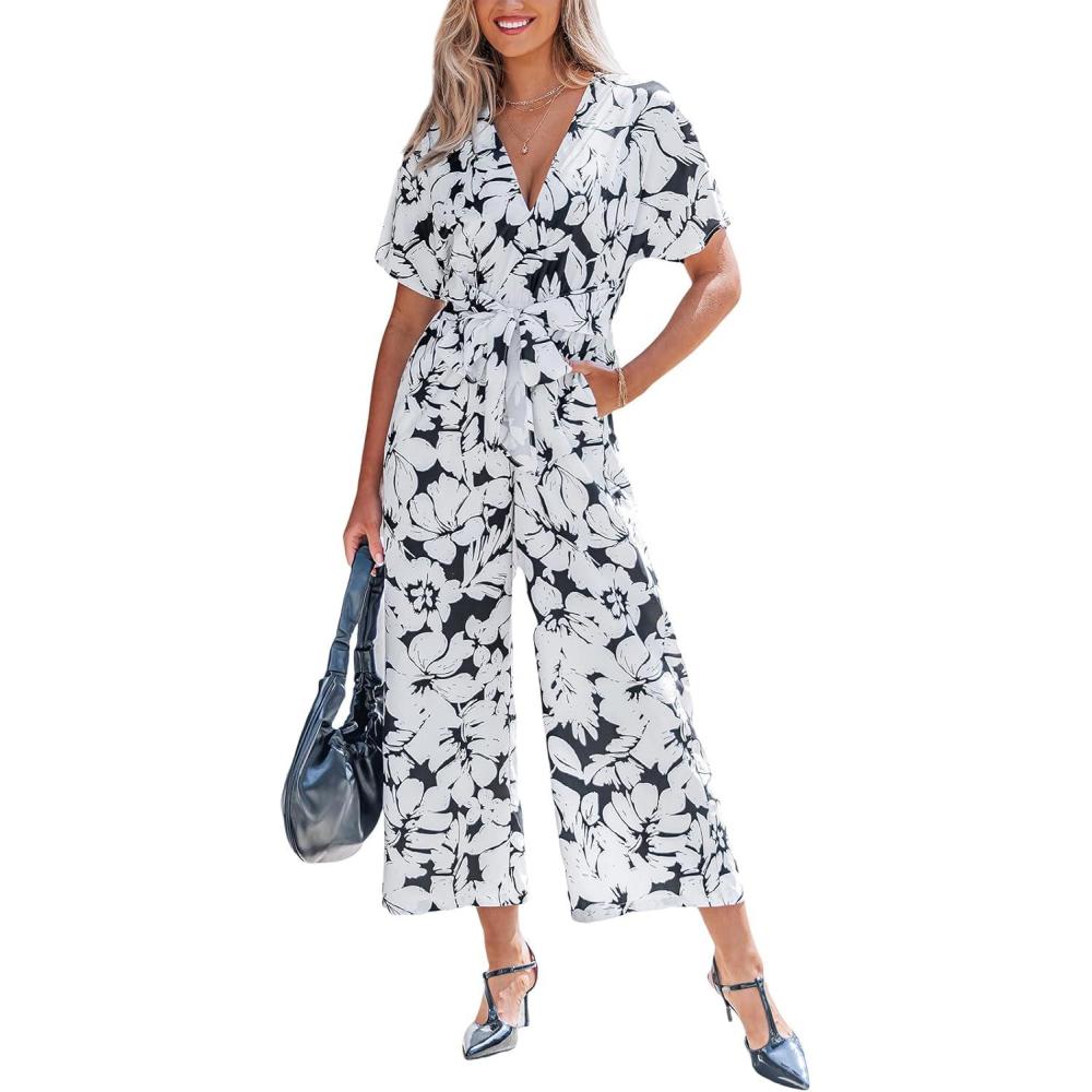 CUPSHE Jumpsuits for Women Dressy Belted Floral Print Overalls V Neck Shorts Sleeves Wide Leg Rompers Vacation Outfits(Black)