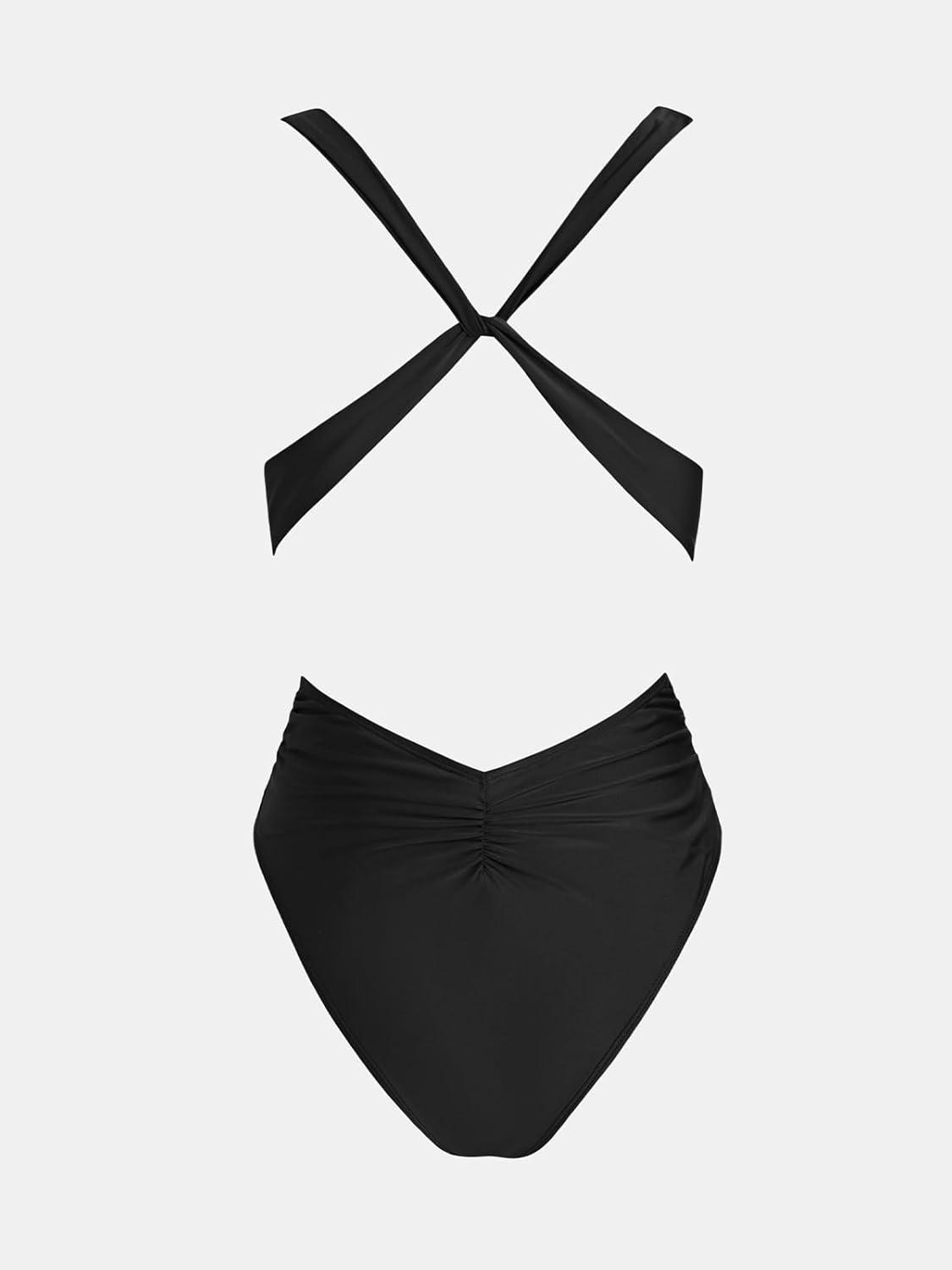 CUPSHE One Piece Swimsuit for Women Bathing Suit Cut Out Cross Back Tie Deep V Neck Ruched High Cut(Black/Stripe)
