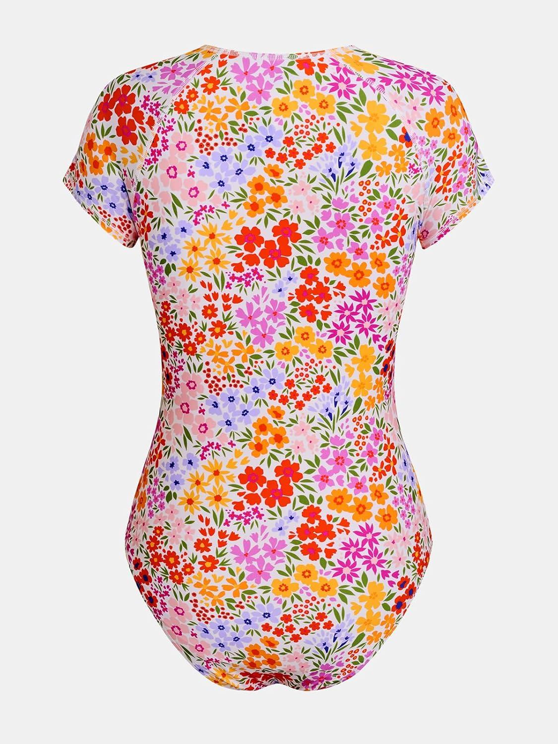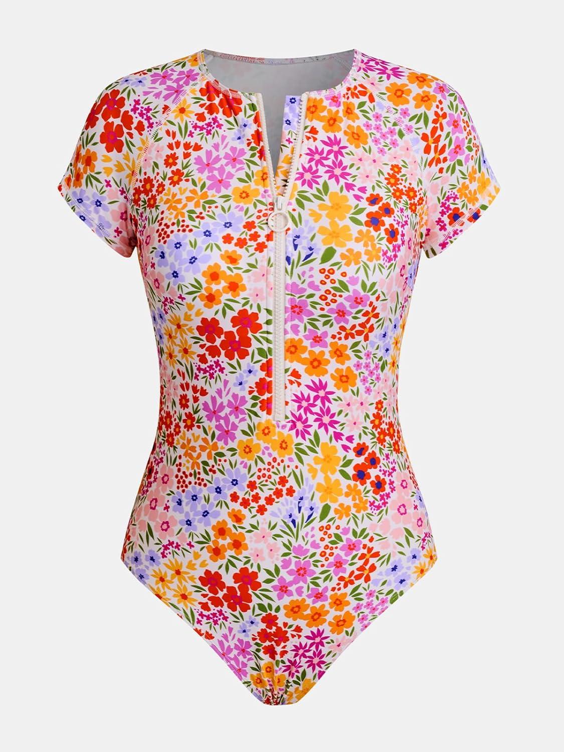 CUPSHE One Piece Swimsuit for Women Mock Neck Zipper Short Sleeve Bathing Suit(Multicolor Floral)