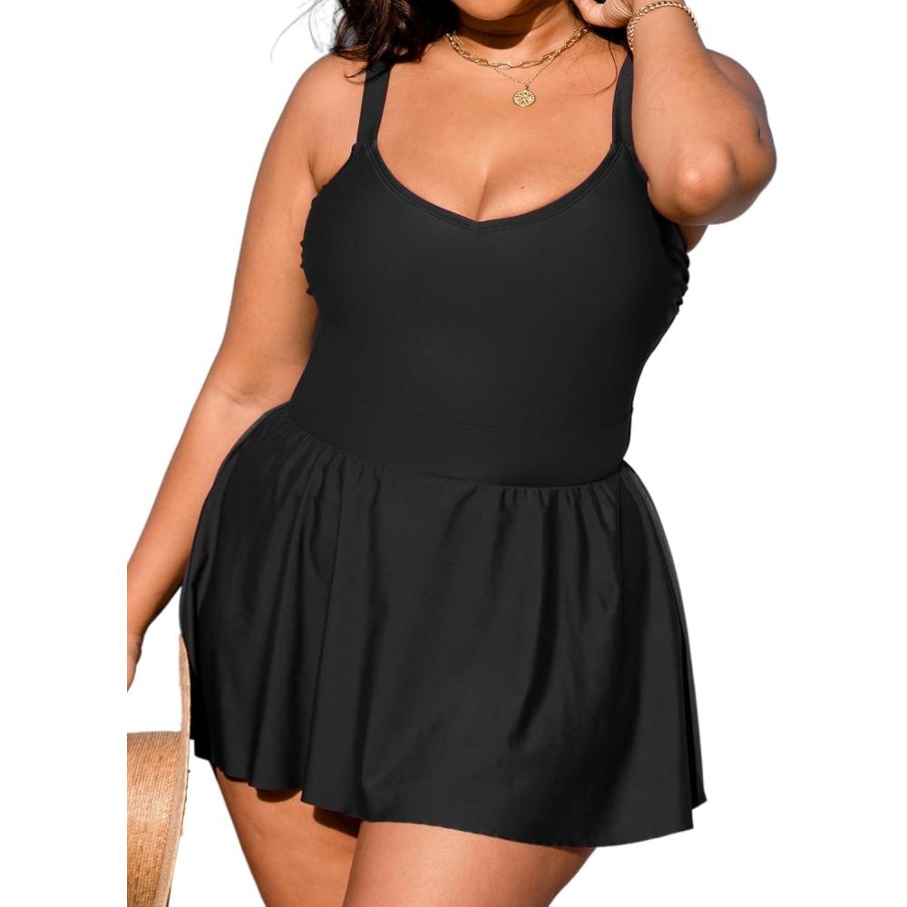 CUPSHE Plus Size Swimsuit for Women One Piece Bathing Suit Scoop Neck Ruffled Swim Dress Adjustable Straps(Black)