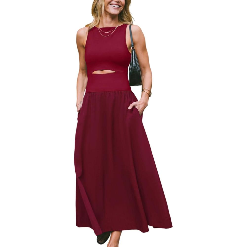 CUPSHE Summer Dress for Women 2025 Formal Sleeveless Round Neck Cutout Pockets Casual A Line Maxi Dress(Burgundy)