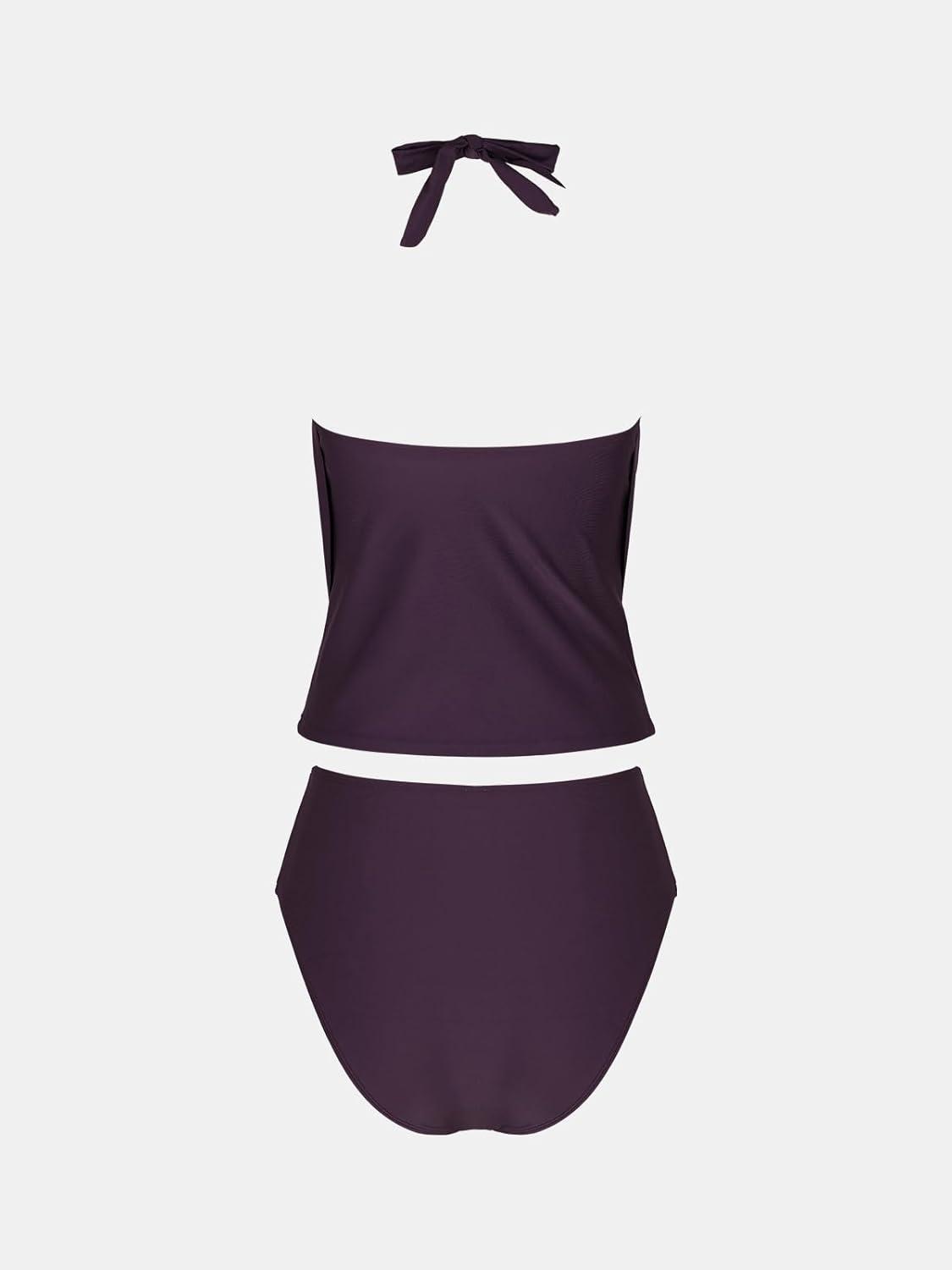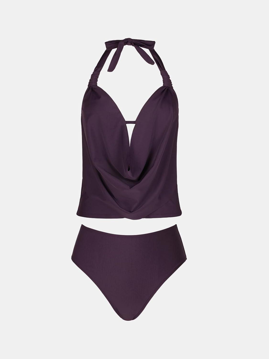 CUPSHE Tankini Bathing Suit for Women Halter Deep V Cowl Neck Low Back Swimsuit(Plum Purple)