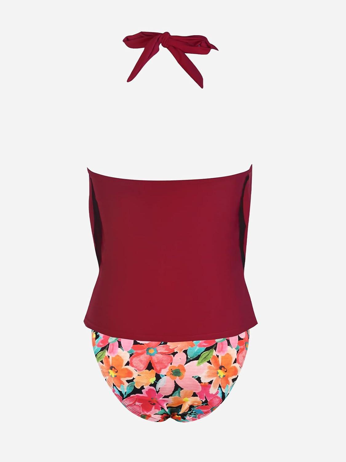 CUPSHE Tankini Bathing Suit for Women Halter Deep V Cowl Neck Low Back Swimsuit(Red/Floral)