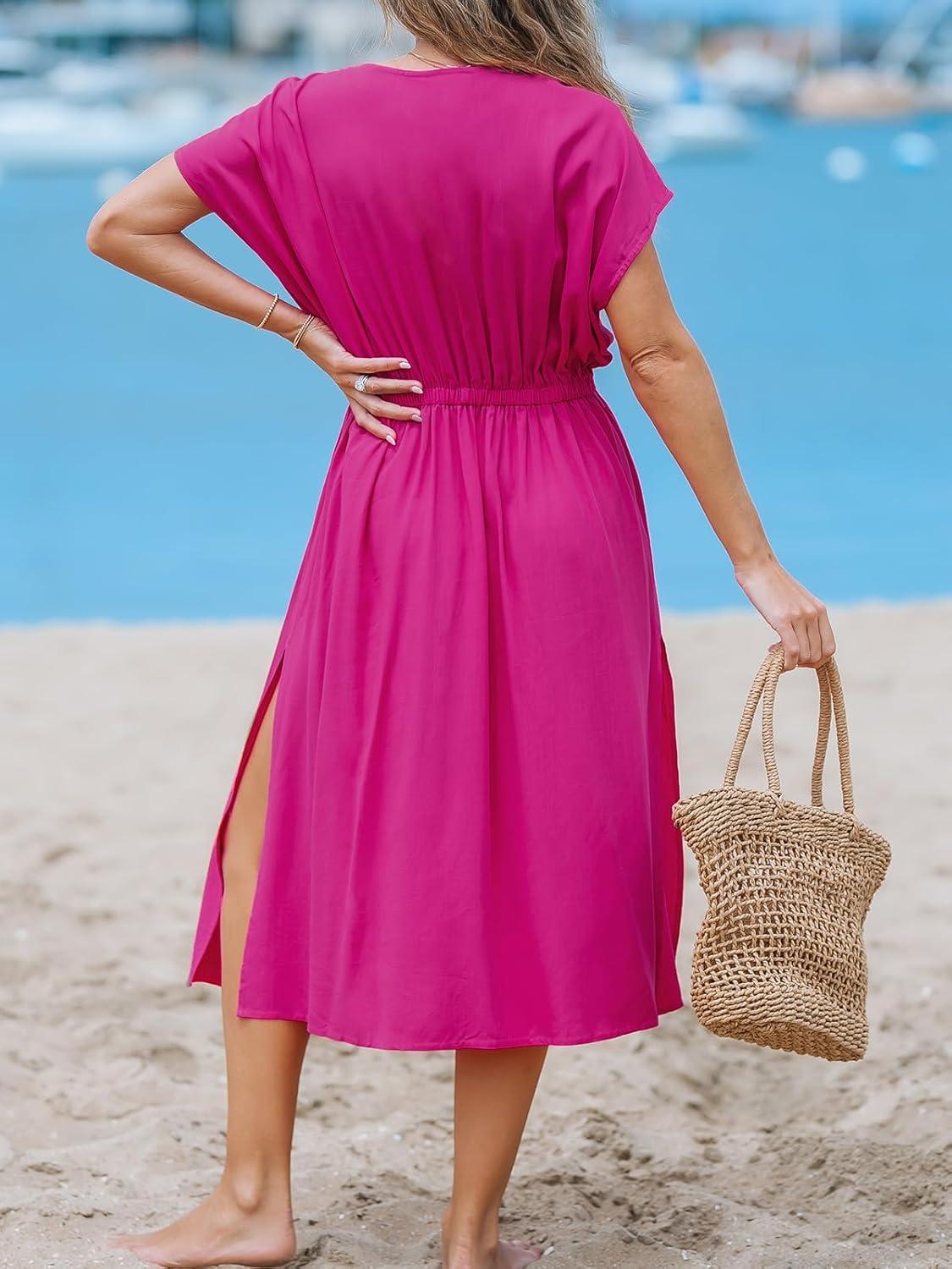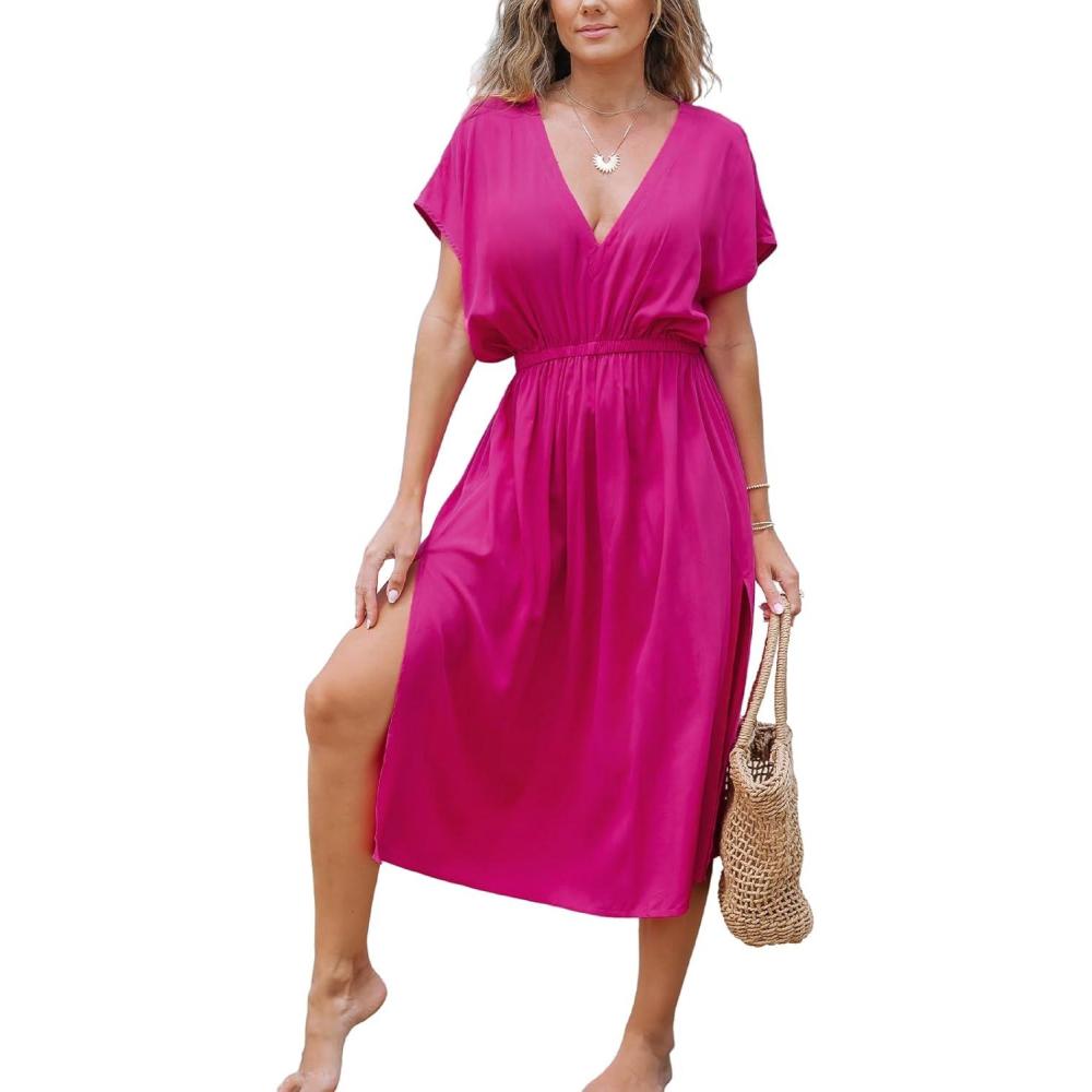 CUPSHE Women Beach Cover Up V Neck Short Sleeve Striped Midi Swimsuit Coverup Dress XS-XXL(Solid Hot Pink)