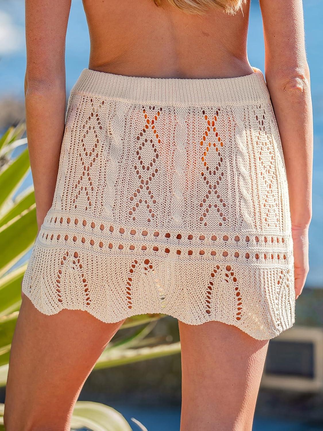 CUPSHE Women Crochet Cover Up Skirt Hollow Out Knit Beach Wrap Mini Skirt(Beige)