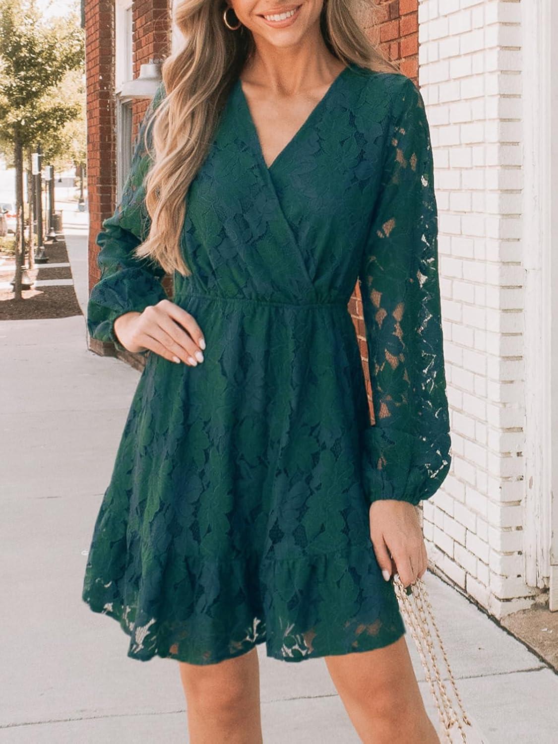 CUPSHE Women Elegant V Neck Lace Peasant Sleeve Mini Summer Dress Elastic High Waist A Line Casual Wedding Guest Dress(Hunter Green)