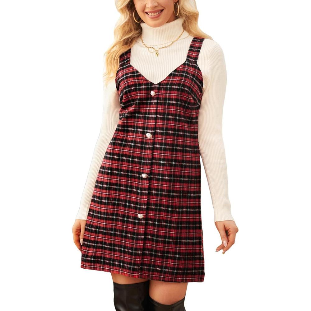CUPSHE Women Fall Dresses for Women Plaid V Neck Sleeveless Wide Straps Holiday Pinafore Mini Overall Dress(Red)