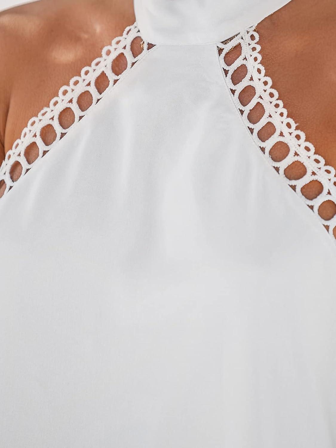 CUPSHE Women Lace Trim Summer Dress Halter High Neck with Tie Backless A Line Lining Casual Sundress Holiday Mini Dress(White)