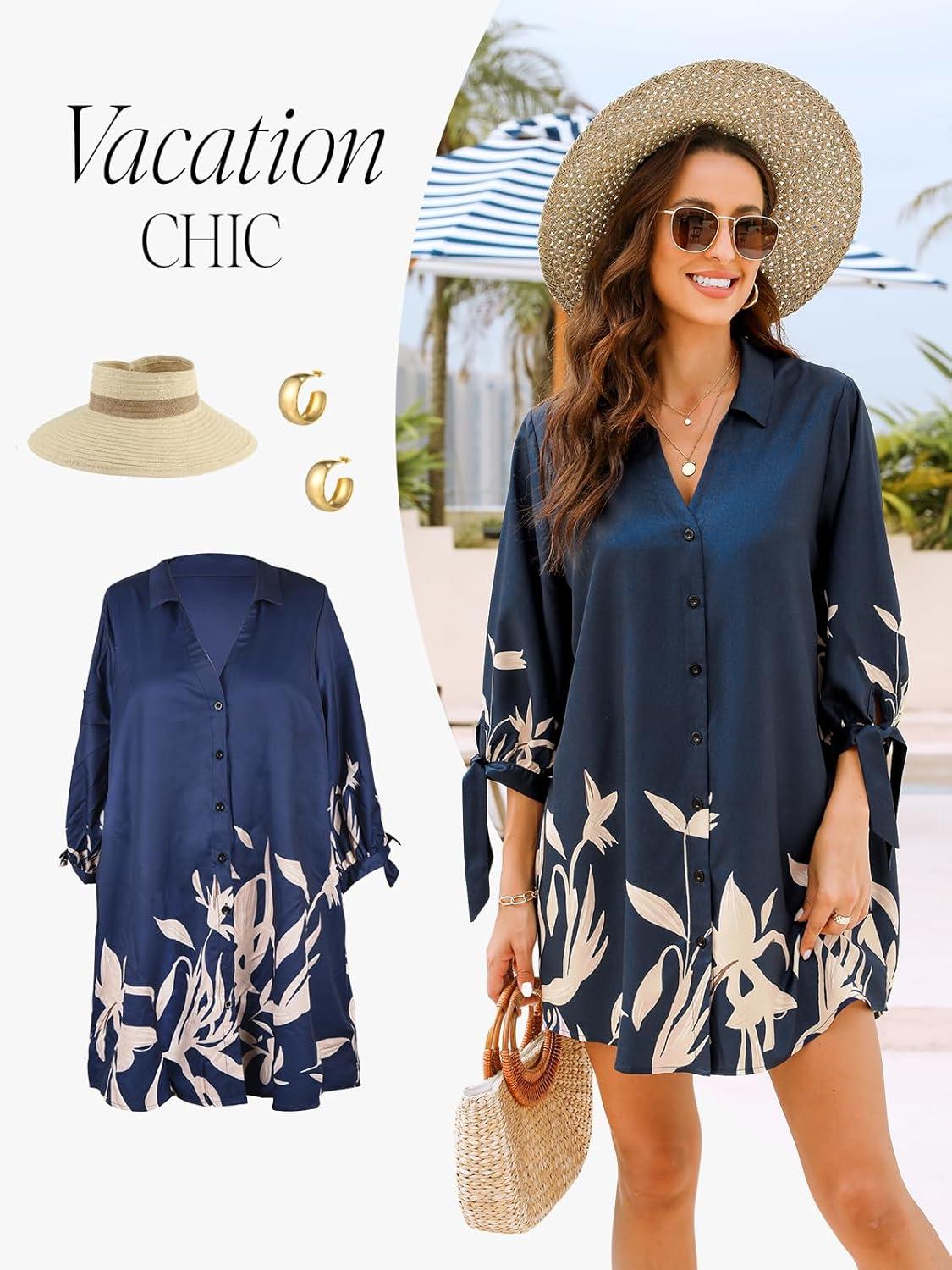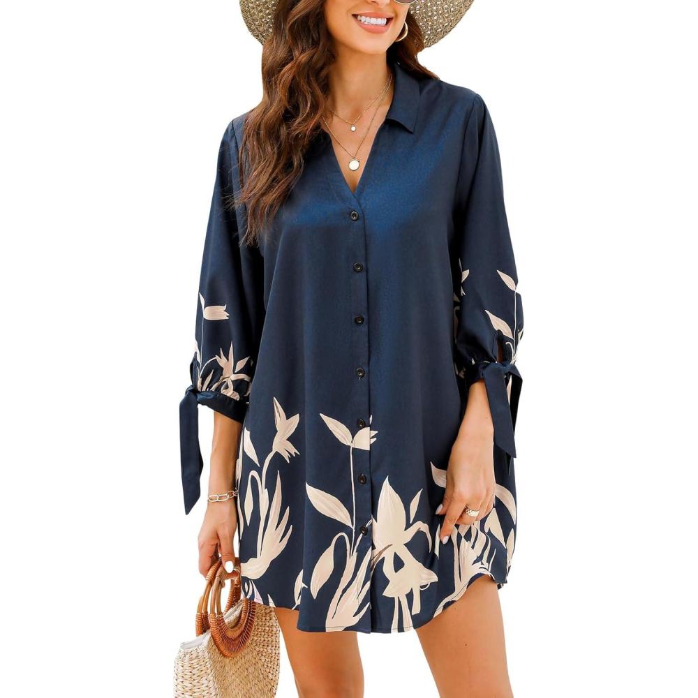 CUPSHE Women Mini Summer Dress Cover Up Oversize Floral Shirt 3/4 Sleeve Cuff Tie Button Down Beach Dresses Cover Up Top(Blue Floral)