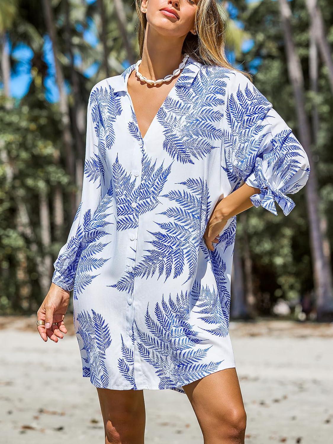 CUPSHE Women Mini Summer Dress Cover Up Oversize Floral Shirt 3/4 Sleeve Cuff Tie Button Down Beach Dresses Cover Up Top(Blue Leaf)