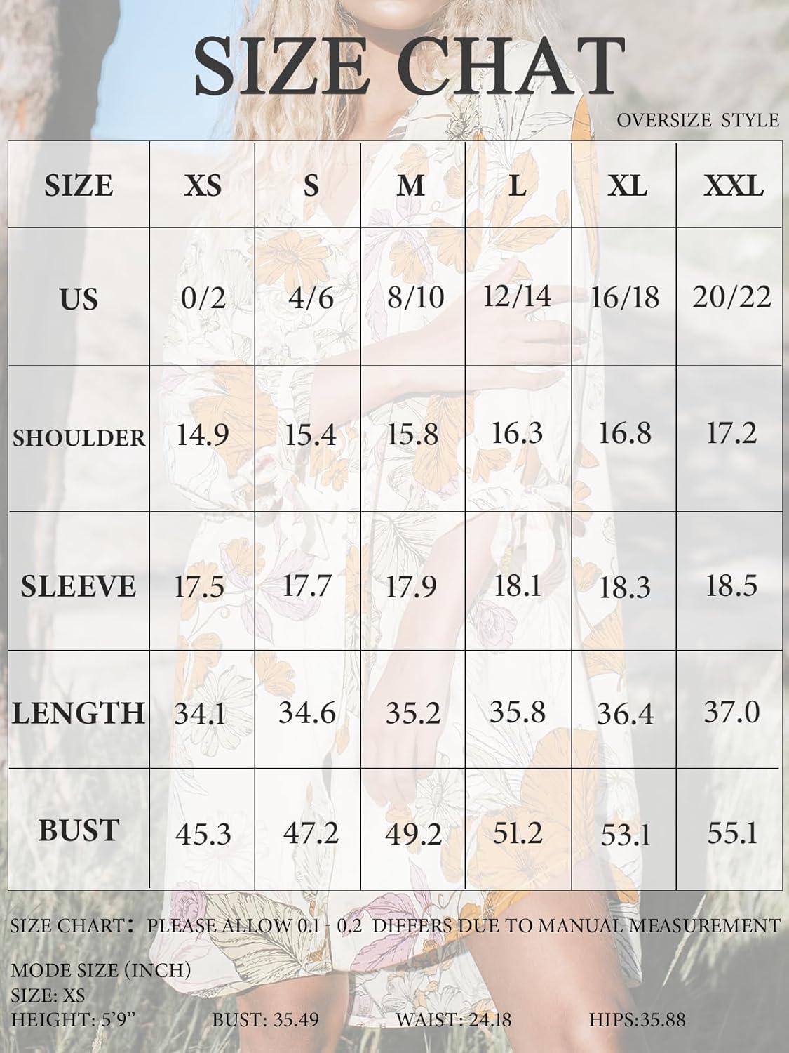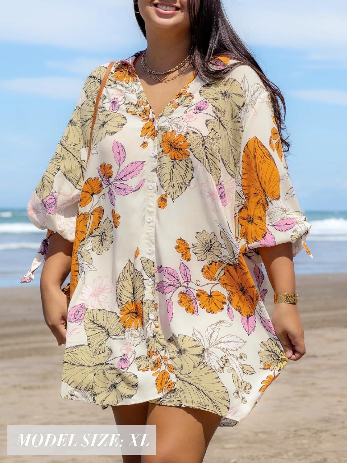 CUPSHE Women Mini Summer Dress Cover Up Oversize Floral Shirt 3/4 Sleeve Cuff Tie Button Down Beach Dresses Cover Up Top(Floral)