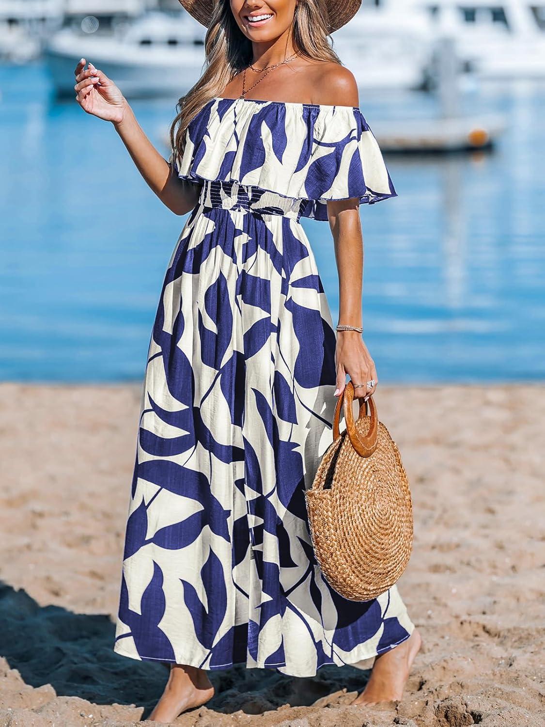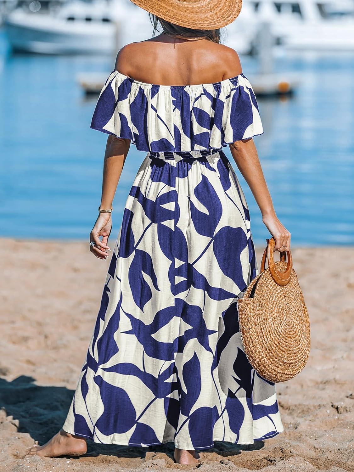 CUPSHE Women Ruffle Floral Maxi Summer Dress Off Shoulder Short Sleeve Backless Flounce Bodice Slit Hem Beach Dresses(Blue White)