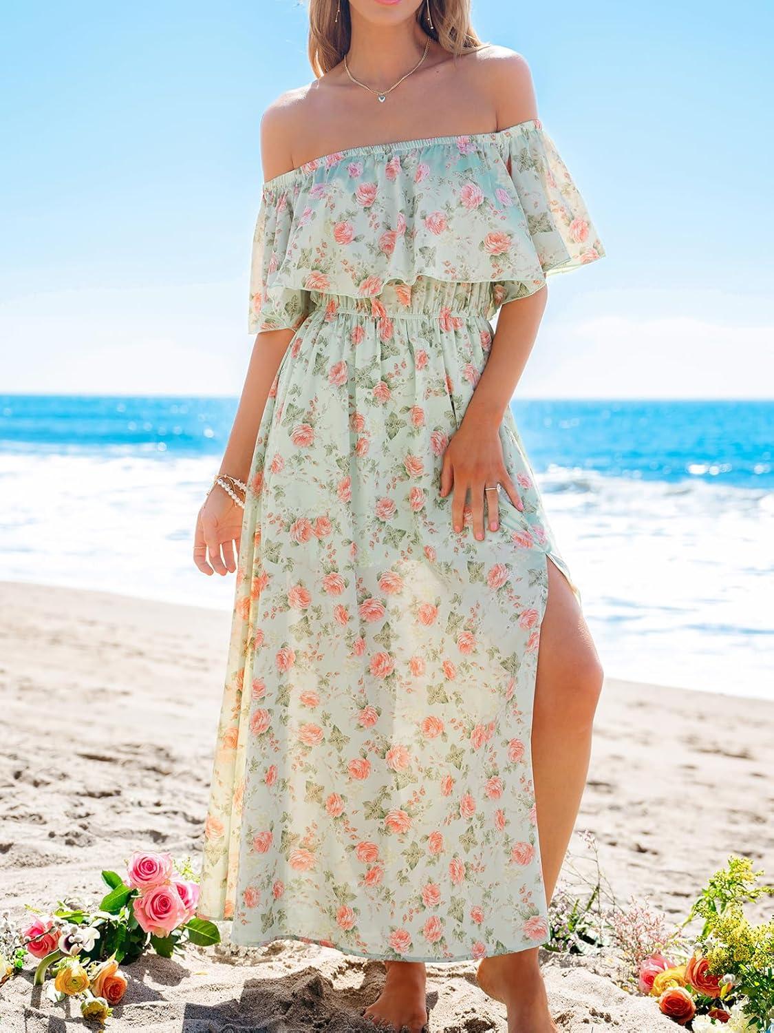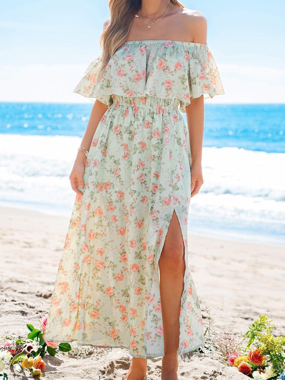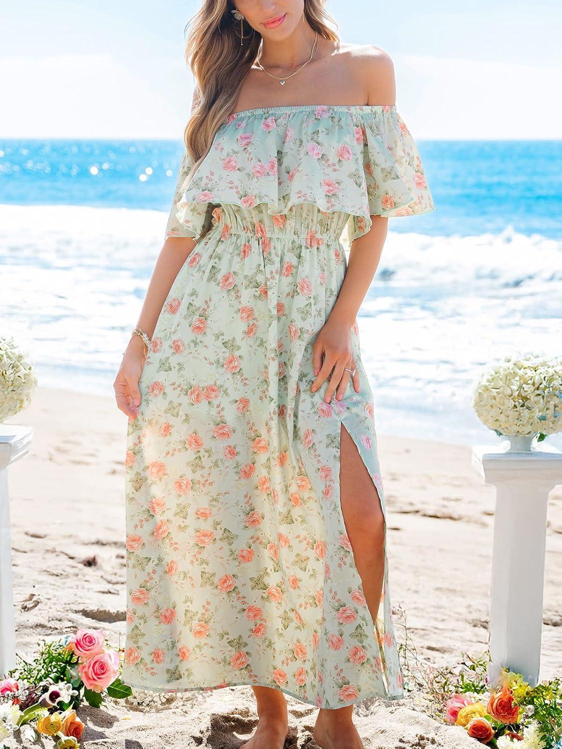 CUPSHE Women Ruffle Floral Maxi Summer Dress Off Shoulder Short Sleeve Backless Flounce Bodice Slit Hem Beach Dresses(Ditsy Floral)