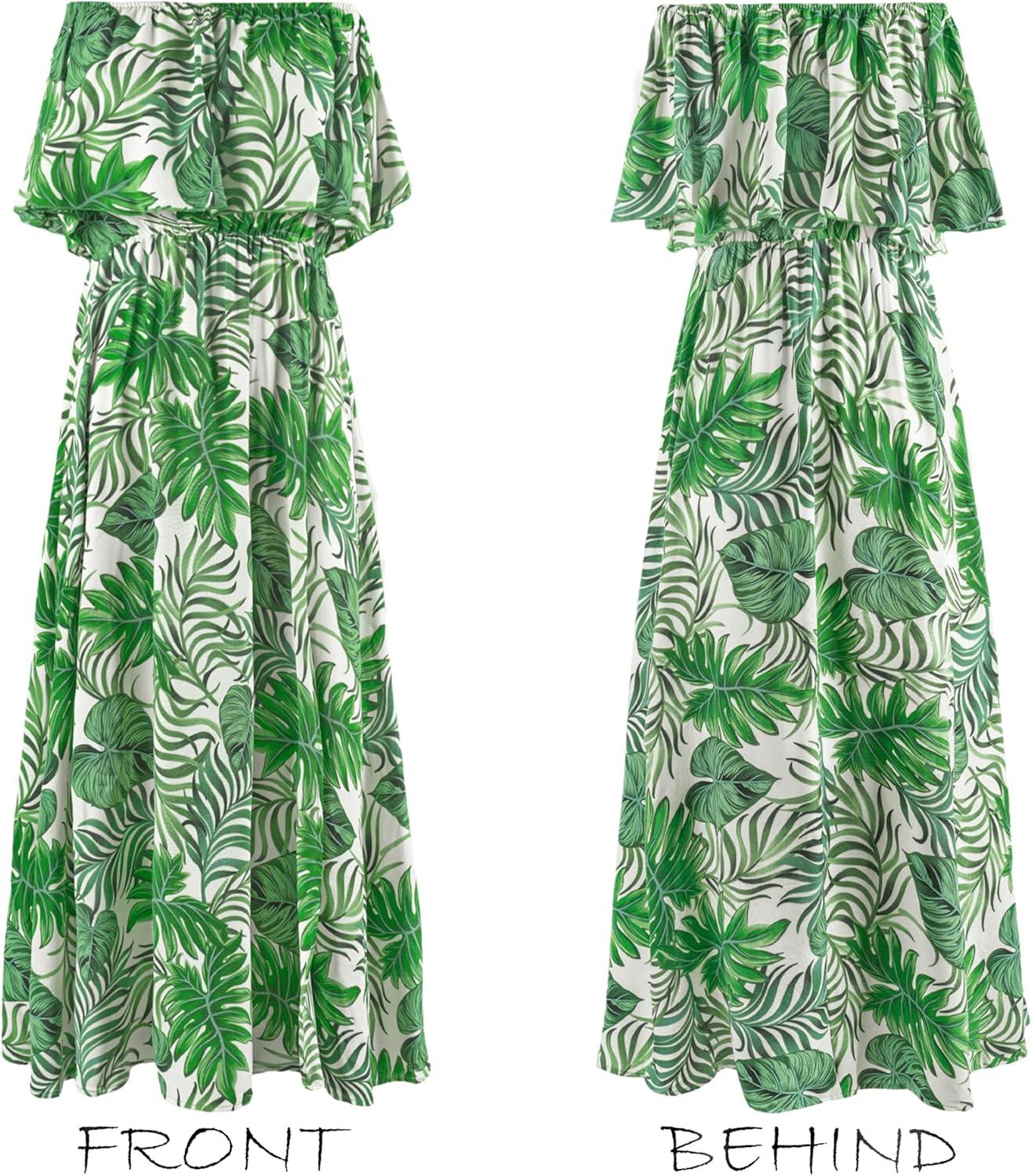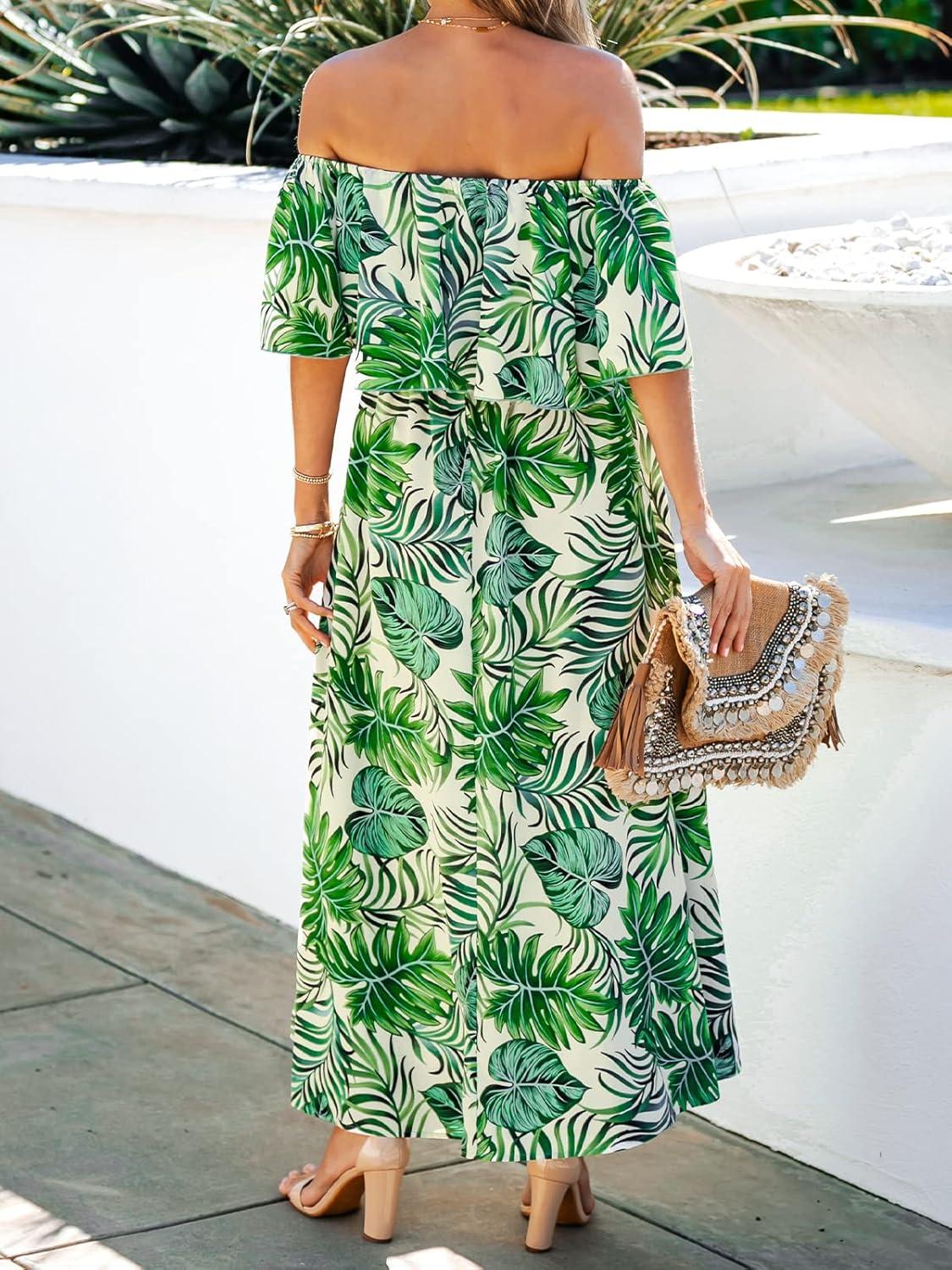CUPSHE Women Ruffle Floral Maxi Summer Dress Off Shoulder Short Sleeve Backless Flounce Bodice Slit Hem Beach Dresses(Light Green)