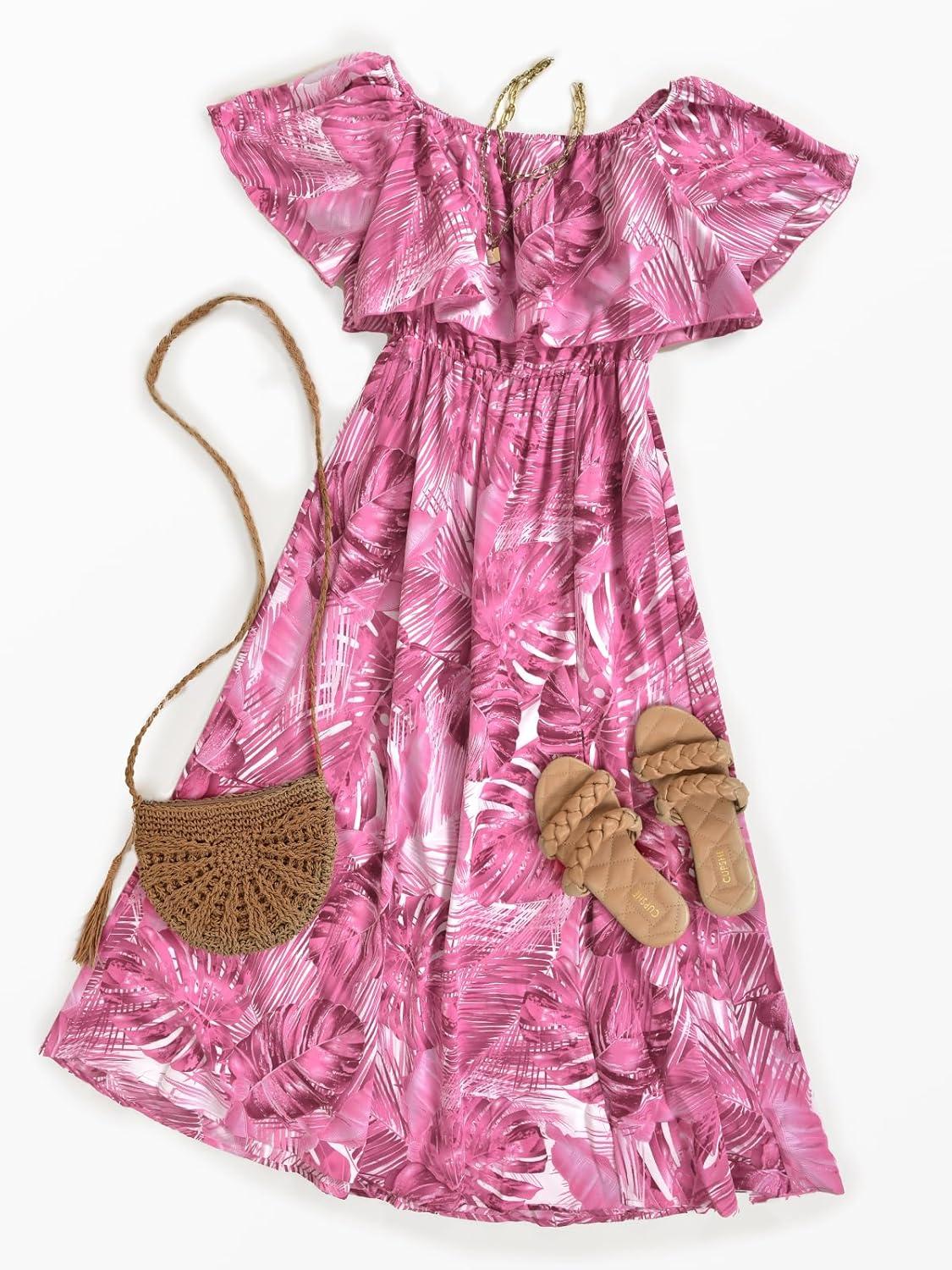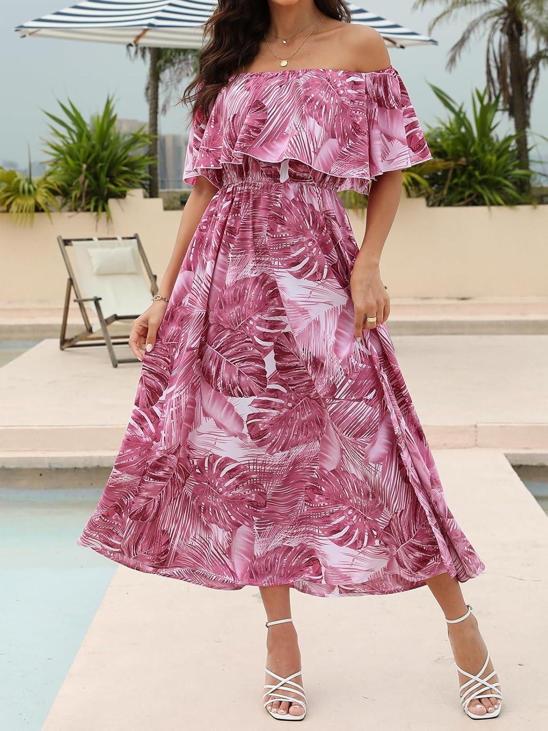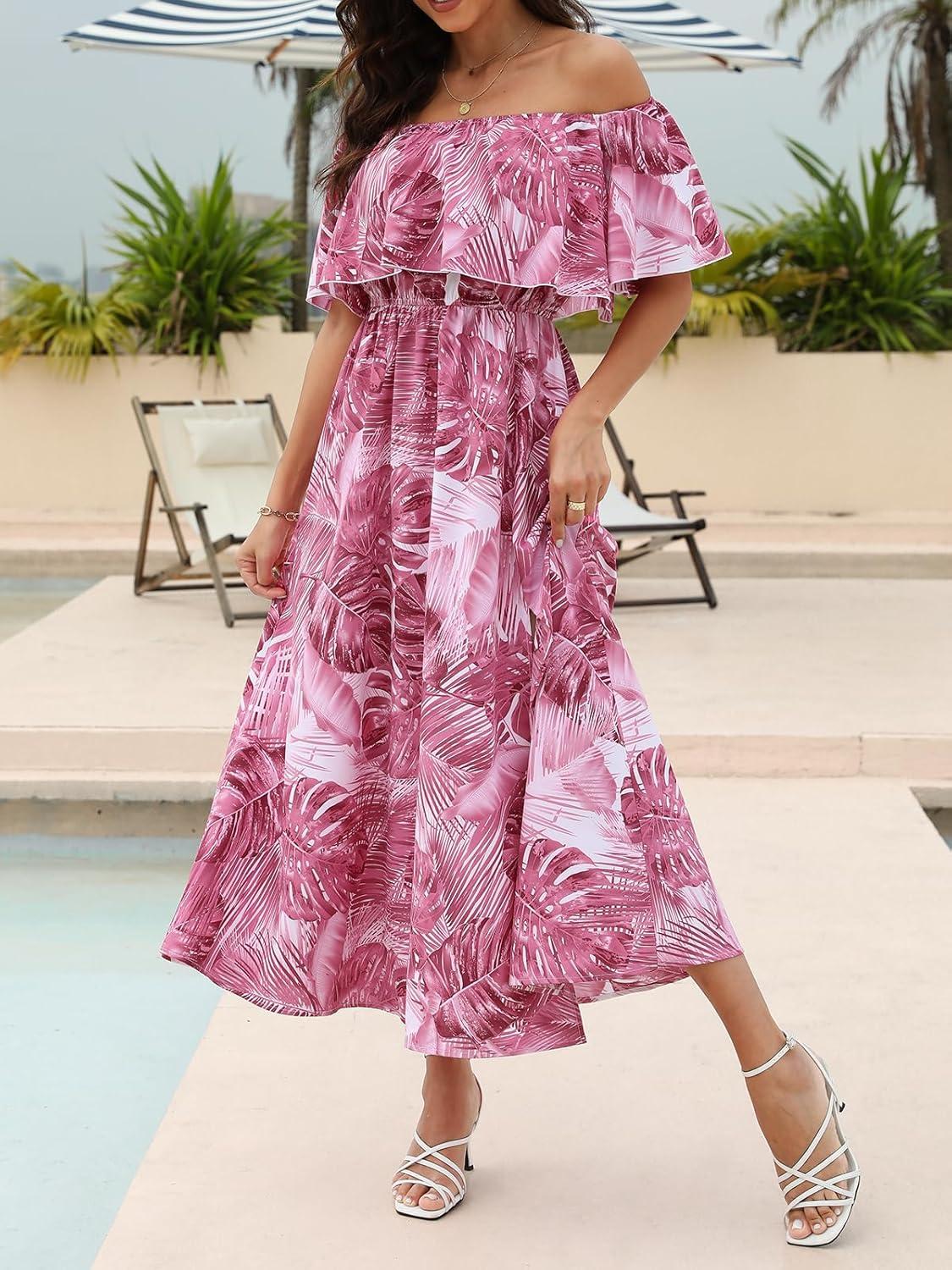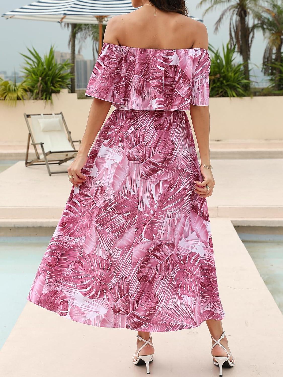 CUPSHE Women Ruffle Floral Maxi Summer Dress Off Shoulder Short Sleeve Backless Flounce Bodice Slit Hem Beach Dresses(Pink)