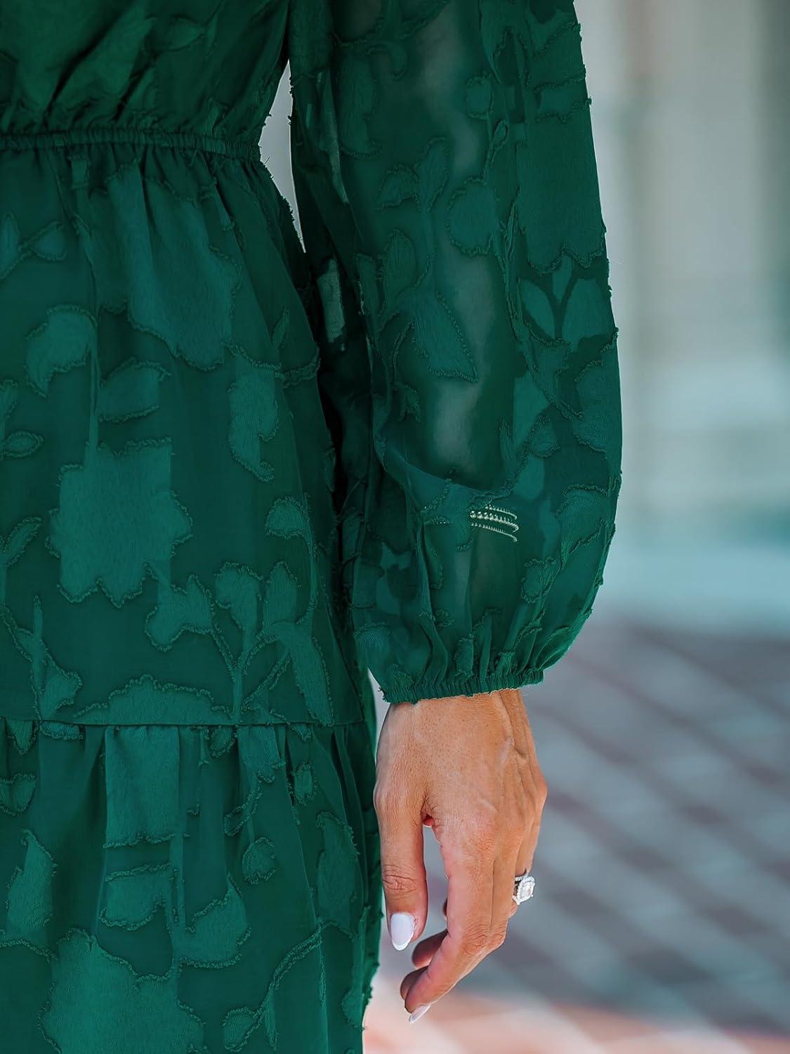CUPSHE Women Ruffle Lace Mini Fall Dresses Semi Formal Wedding Guest Dress V Neck Long Puff Sleeve Elastic Waist Tie(Green)