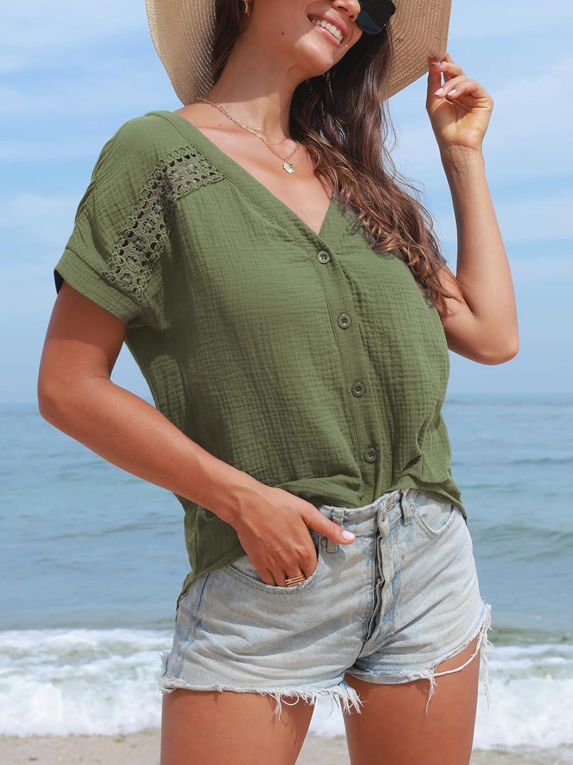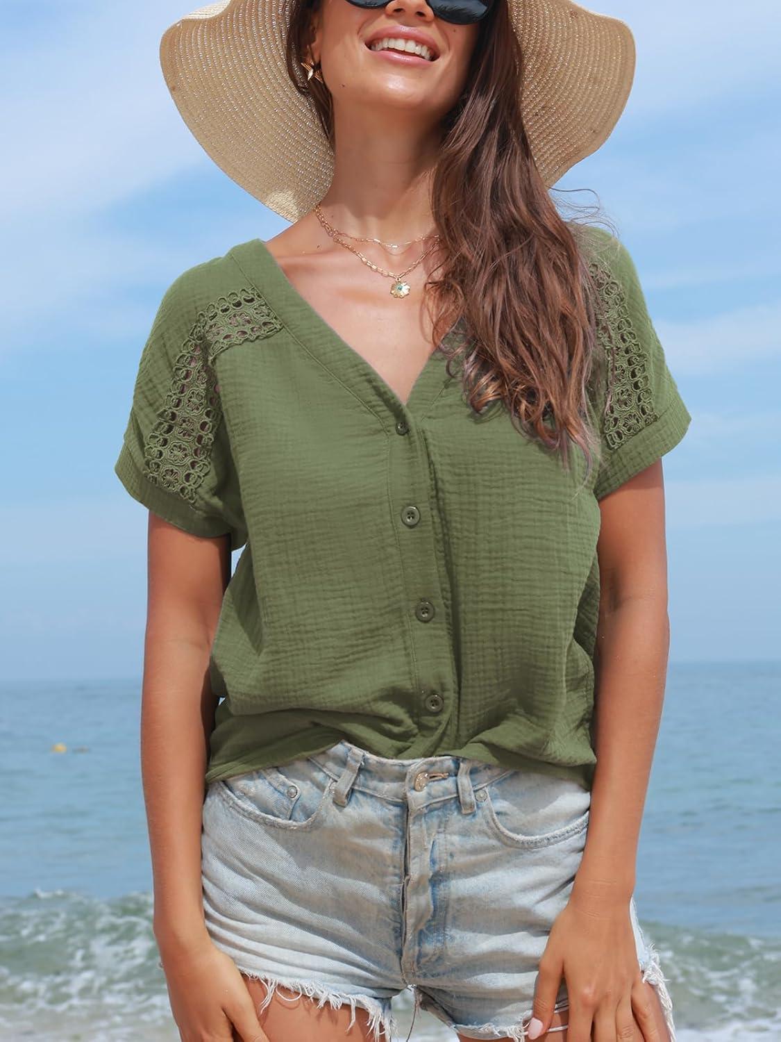 CUPSHE Women Summe Tops V Neck Blouses Short Sleeves Lace Shirt Button Front Tee Work Vacation Outfits(Green)