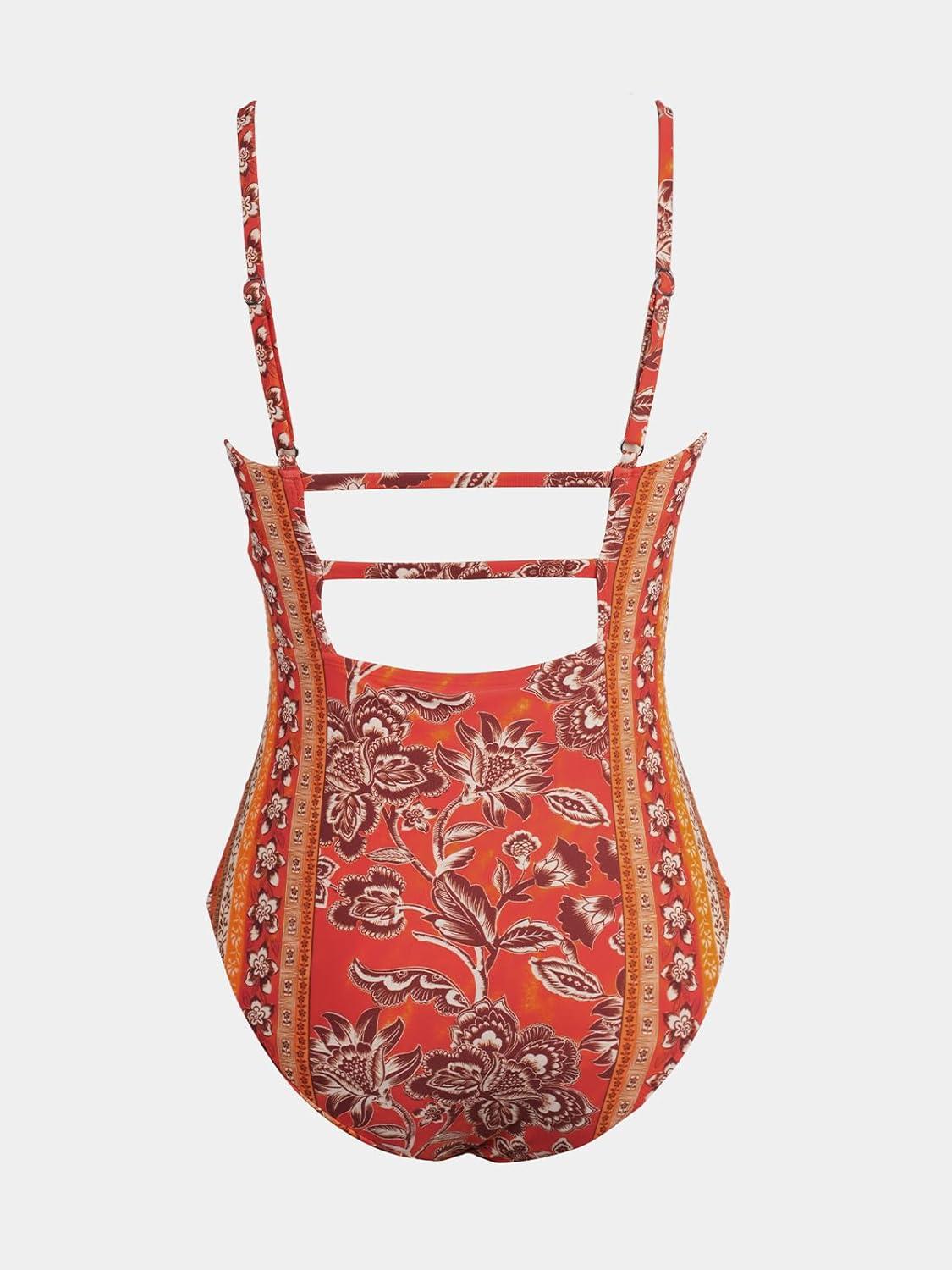CUPSHE Women Swimsuit One Piece Bathing Suit Square Neck Cutout Back Tummy Control with Adjustable Spaghetti Straps(Red/Yellow Floral)