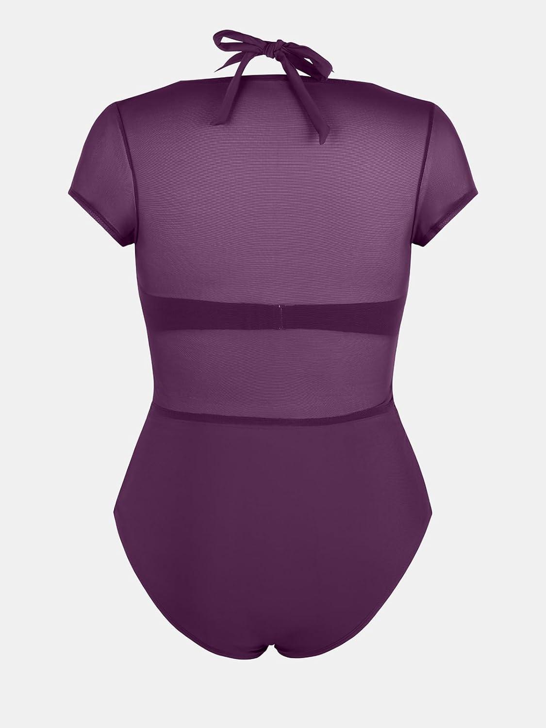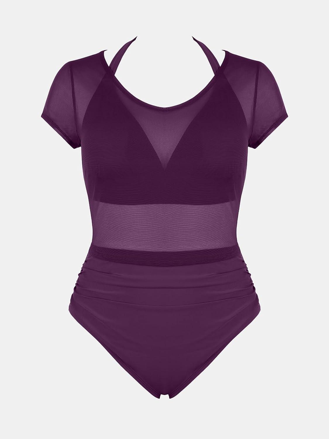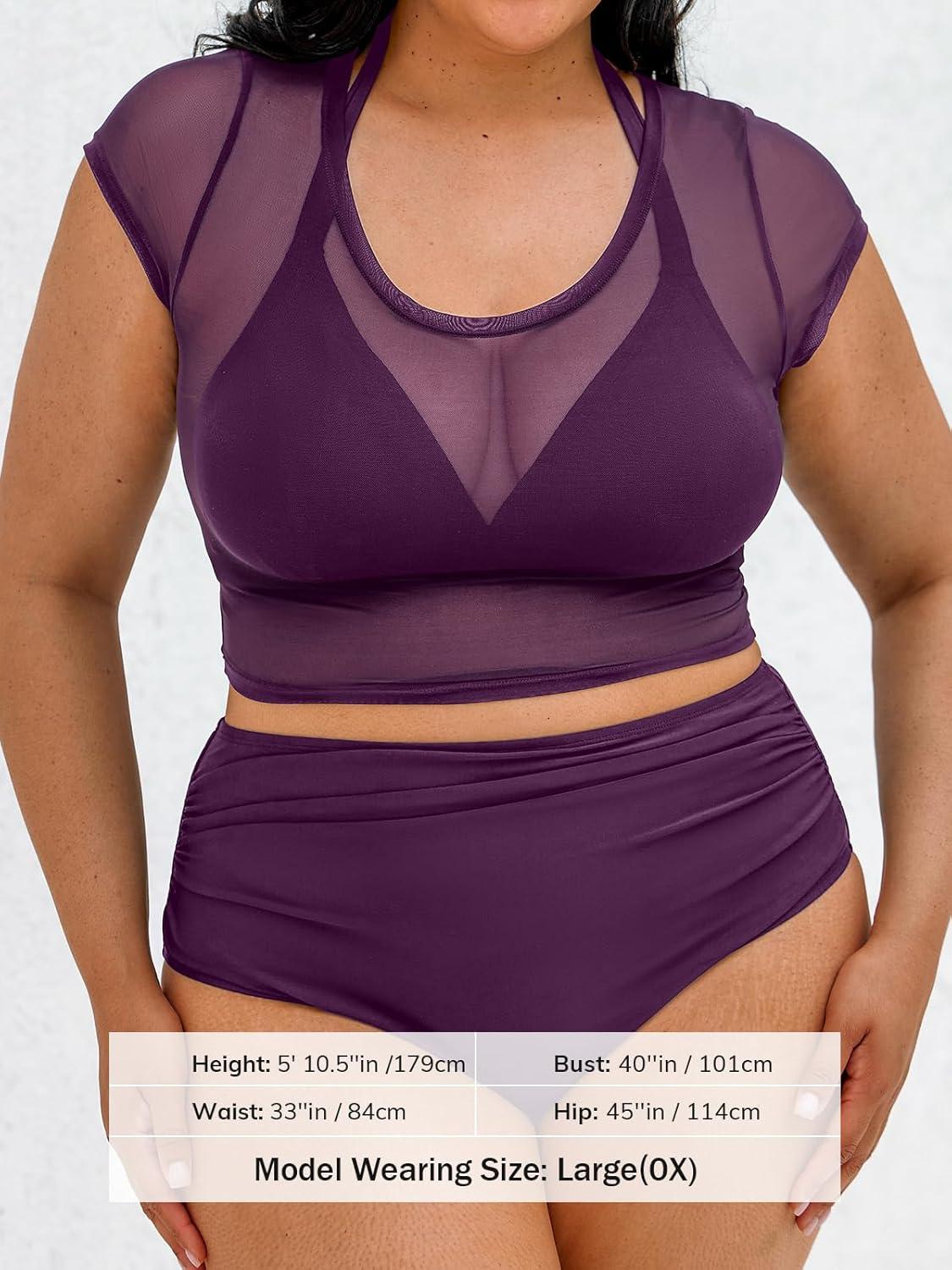 CUPSHE Women Swimsuit Plus Size Bikini Set Three Piece High Waisted Sheer Mesh Top Halter Ruched Bottom(Blackberry Wine)
