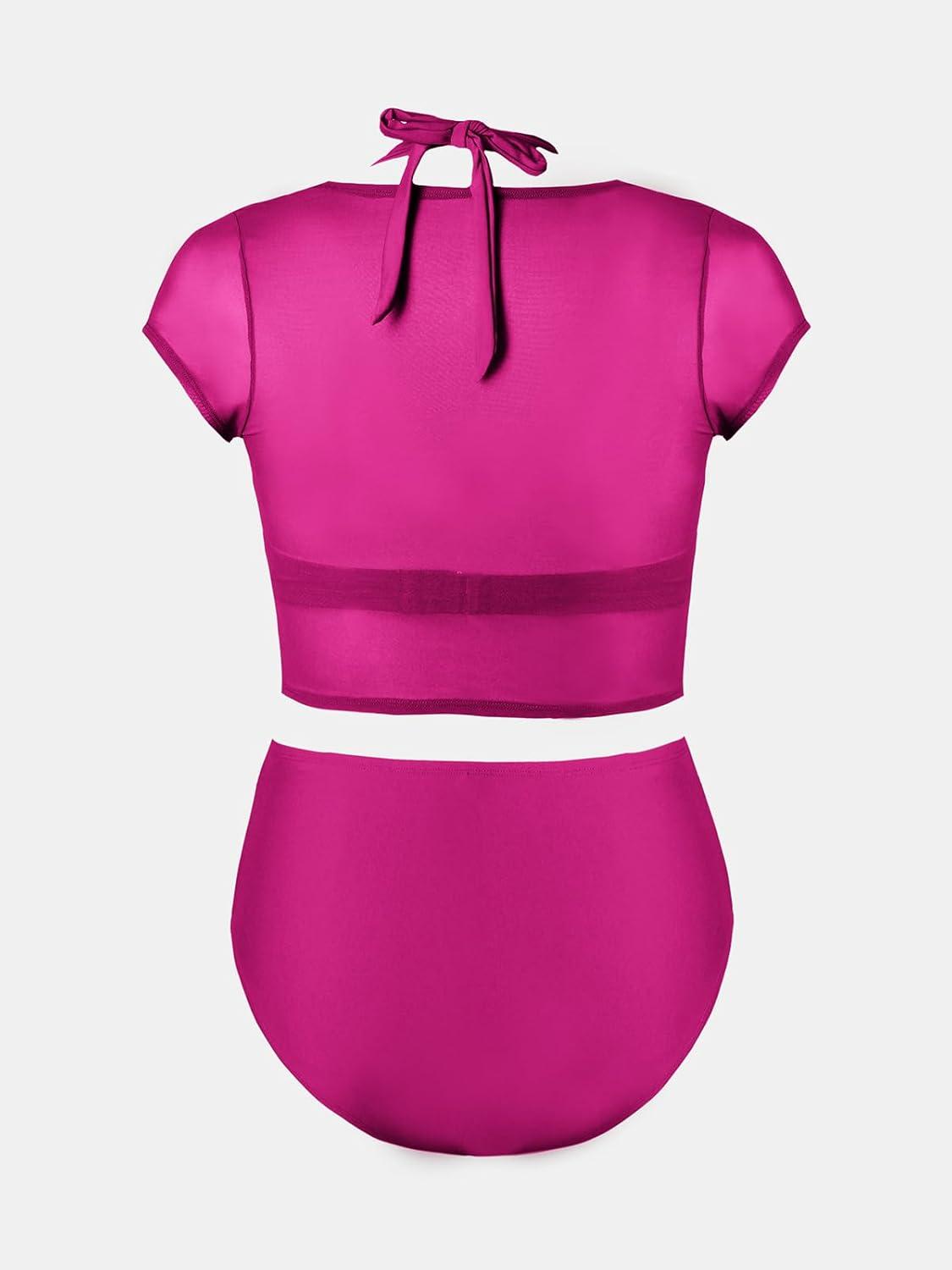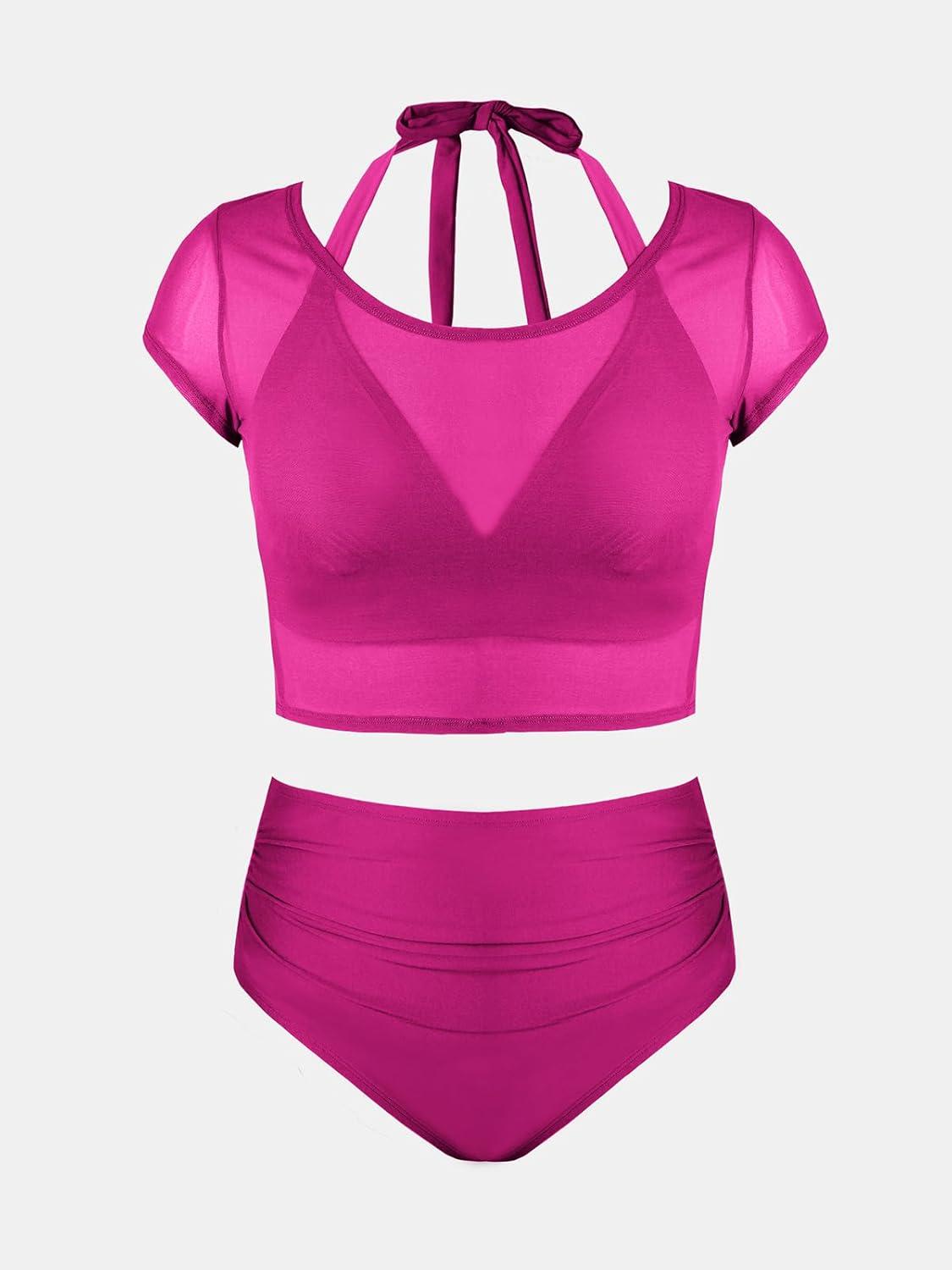 CUPSHE Women Swimsuit Plus Size Bikini Set Three Piece High Waisted Sheer Mesh Top Halter Ruched Bottom(Orchid Pink)
