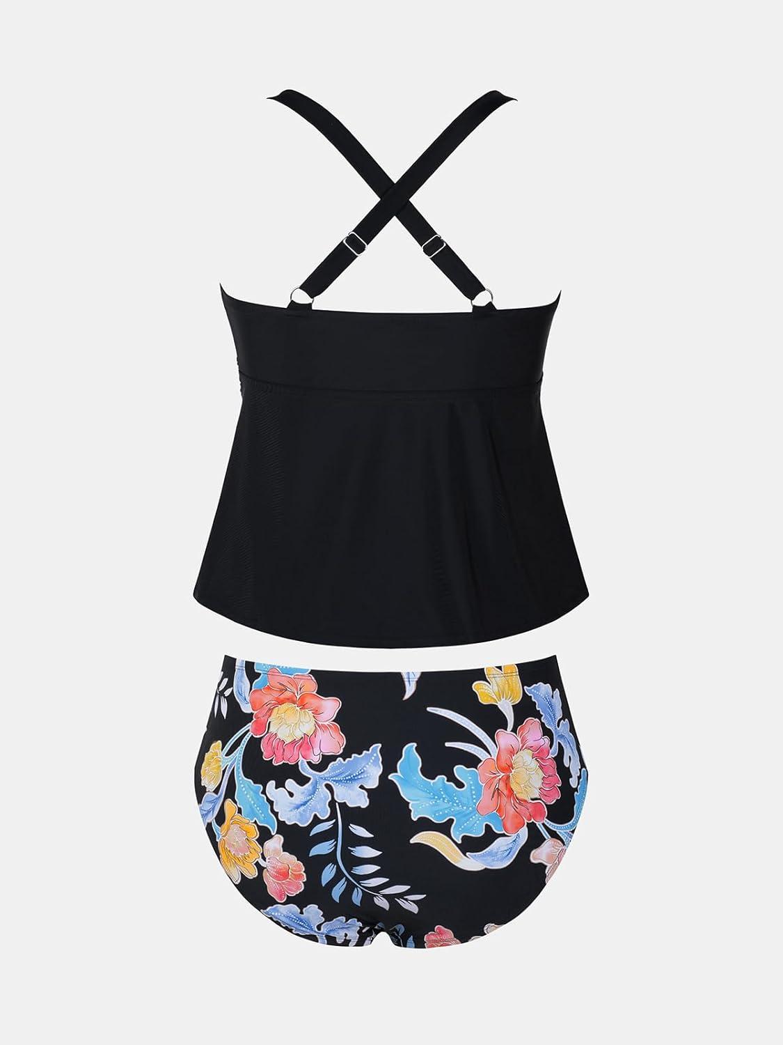 CUPSHE Women Tankini Sets Plus Size Two Piece Swimsuit V Neck Mid Rise Crisscross Back Tie O Ring(Black/Floral)