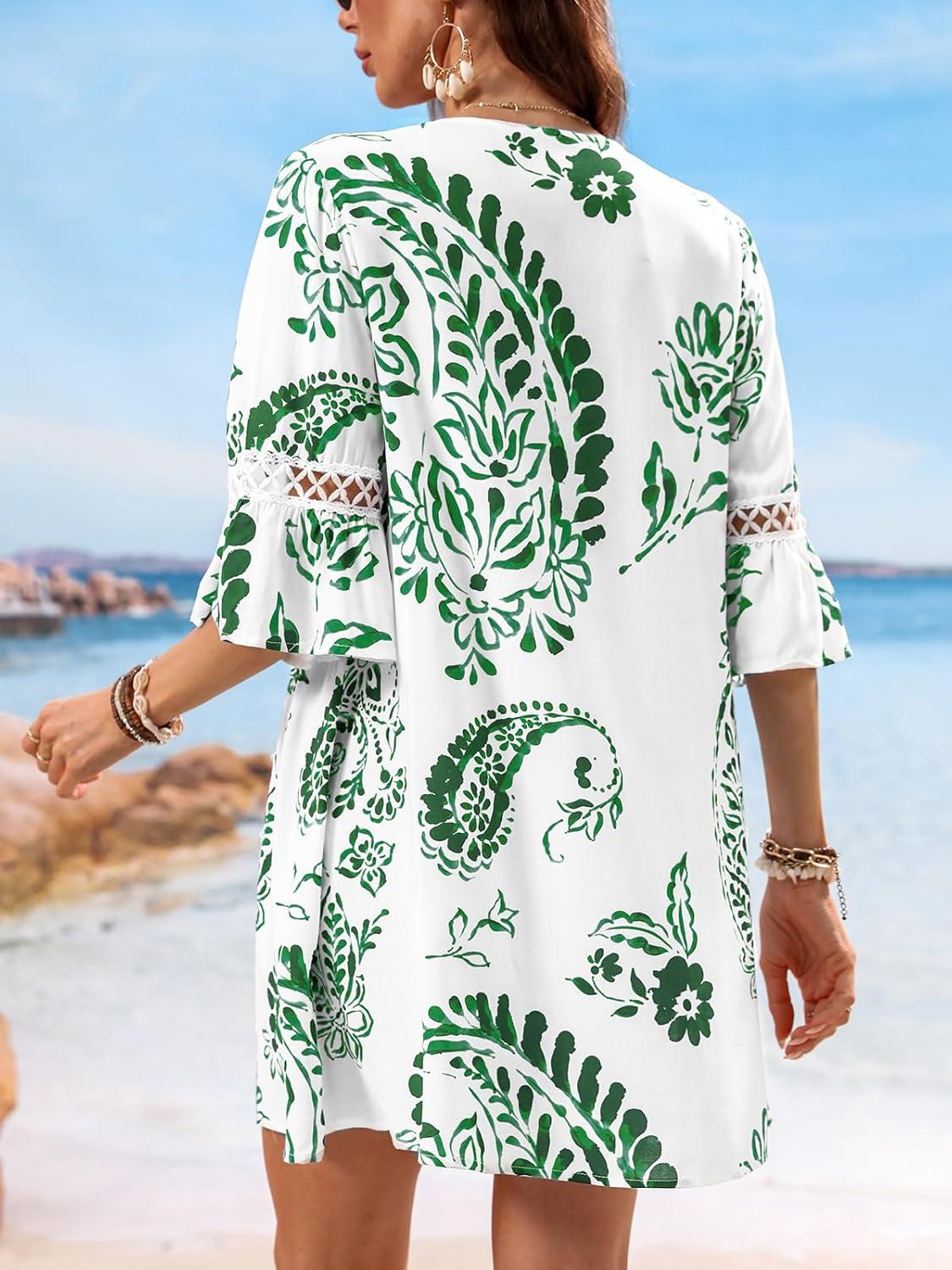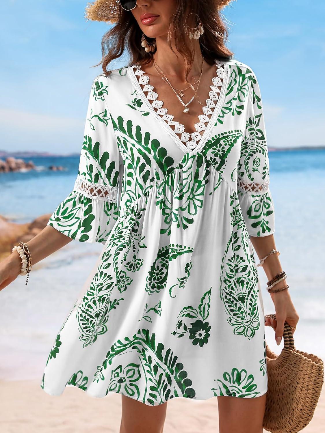 CUPSHE Women V Neck Lace Trim Mini Summer Dress Cover Up 3/4 Sleeve Ruffled Cuff Casual Sundress Beach Dresses Cover Ups(Green)