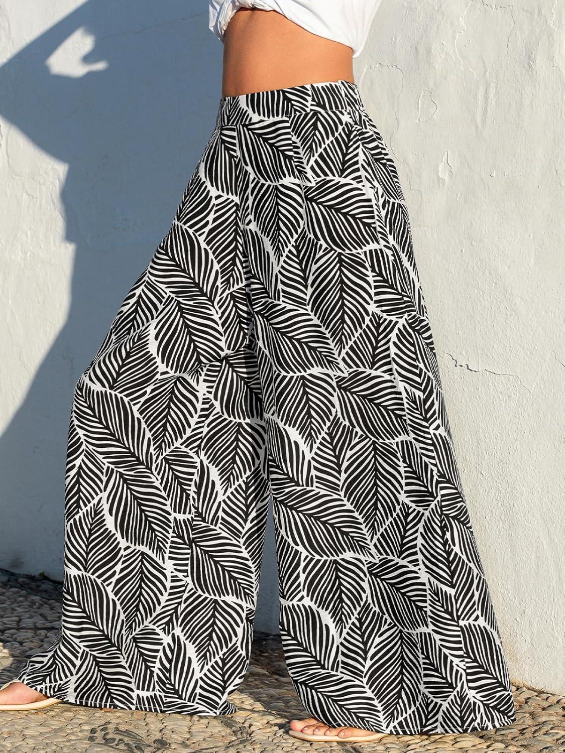 CUPSHE Women Wide Leg Beach Pants Tropical Floral Plus Size Pants with Pockets Vacation Casual Dressy(Black-2)