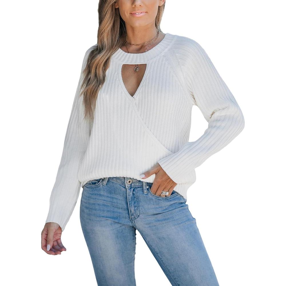CUPSHE Women’s 2024 Fall Cutout Pullover Sweaters Long Sleeve Ribbed Knit Wrap Jumper Tops(White)