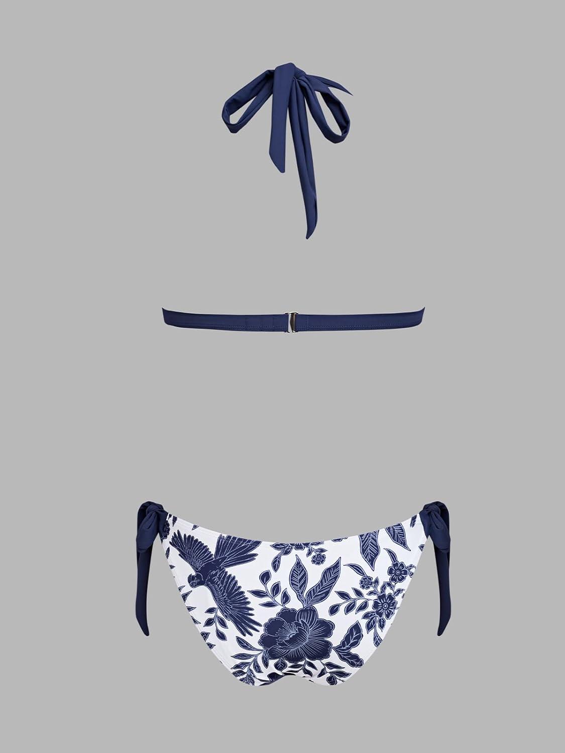 CUPSHE Women’s Bikini Set Two Piece Swimsuits V Neck Halter Strap Back Hook Bathing Suit Mid Rise Side Tie Swimwear(Navy Blue/Floral)