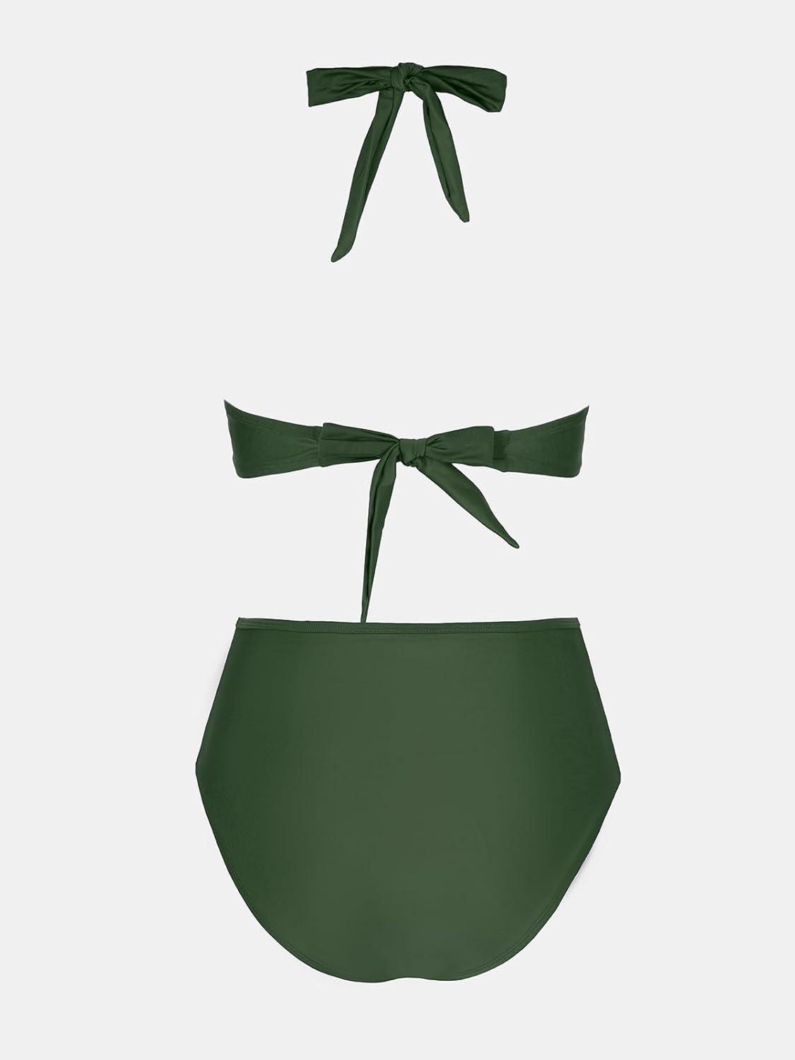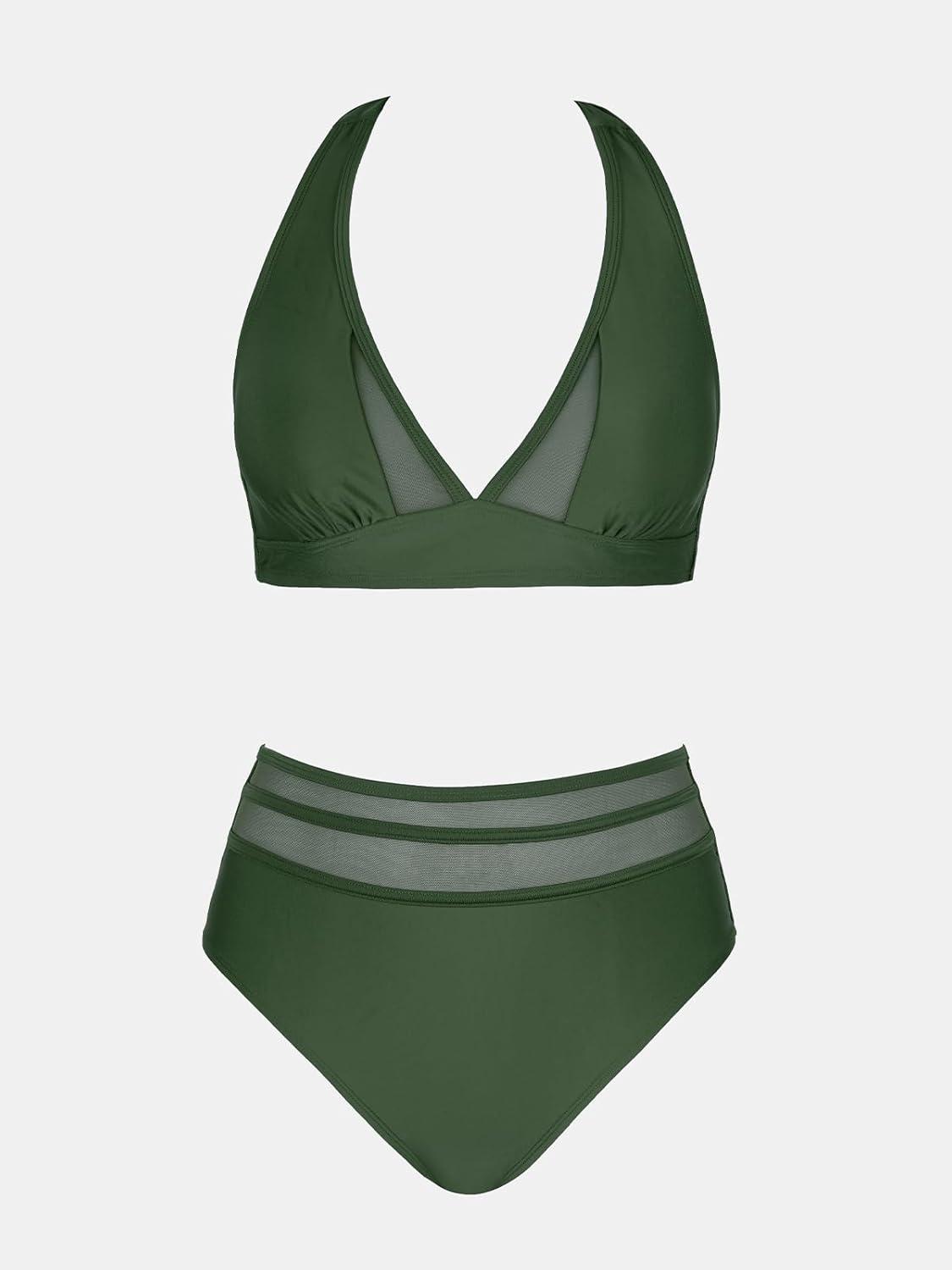 CUPSHE Women’s Bikini Sets Halter V Neck Tie Back Bathing Suit Mesh Panel High Waisted Bottom(Forest Green)