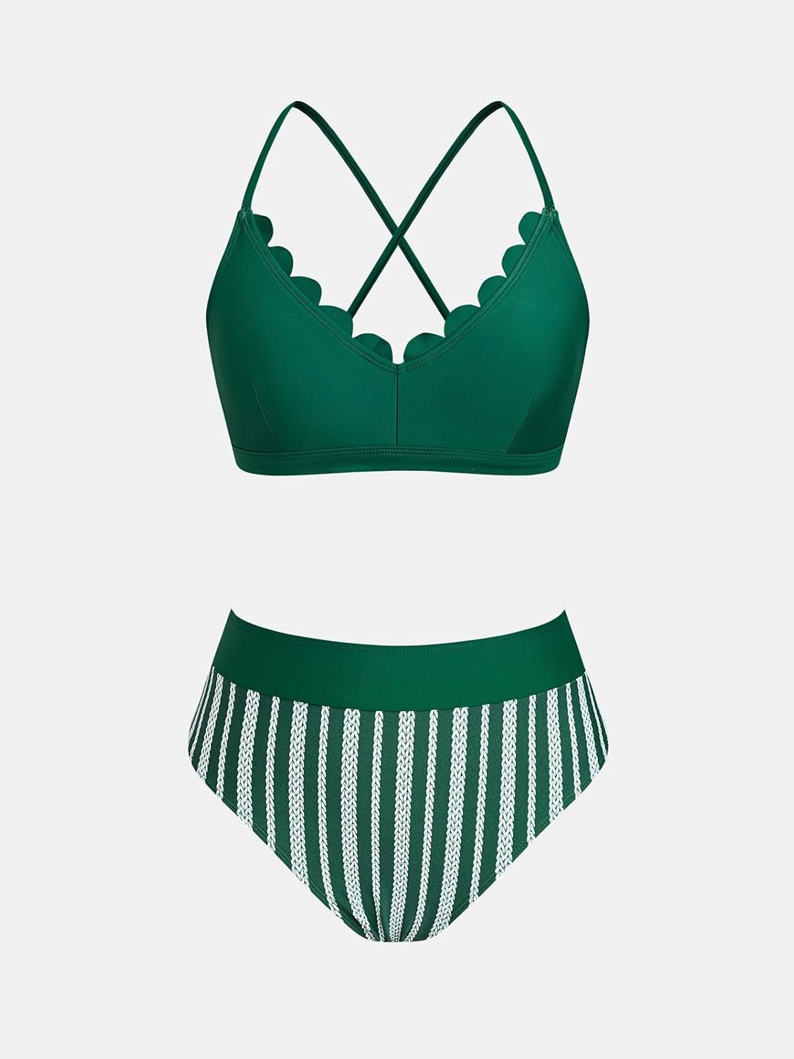 CUPSHE Women’s Bikini Sets High Waisted Scalloped V Neck Two Piece Crisscross Self Tie Spaghetti Straps Bathing Suit(Deep Green/Striped)