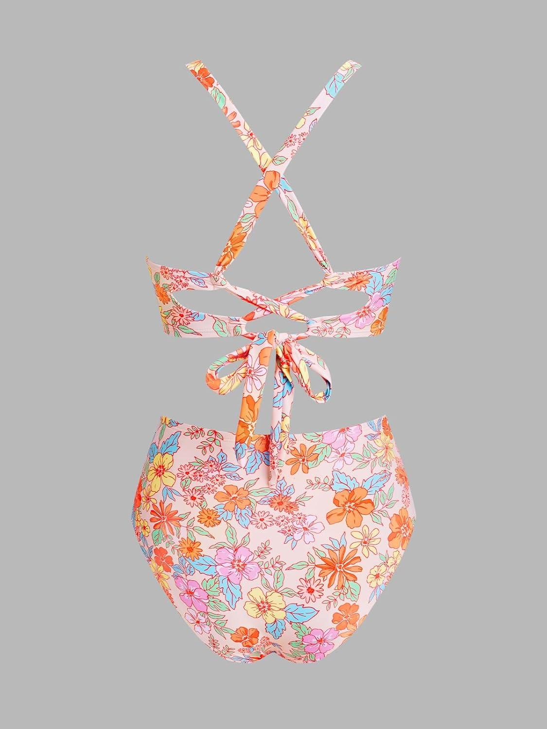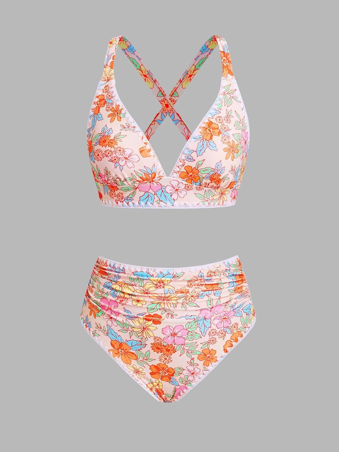 CUPSHE Women’s Bikini Sets High Waisted Swimsuit Deep V Neck Crisscross Back Tie Stitching Ruched Full Coverage(Light Pink/Floral)